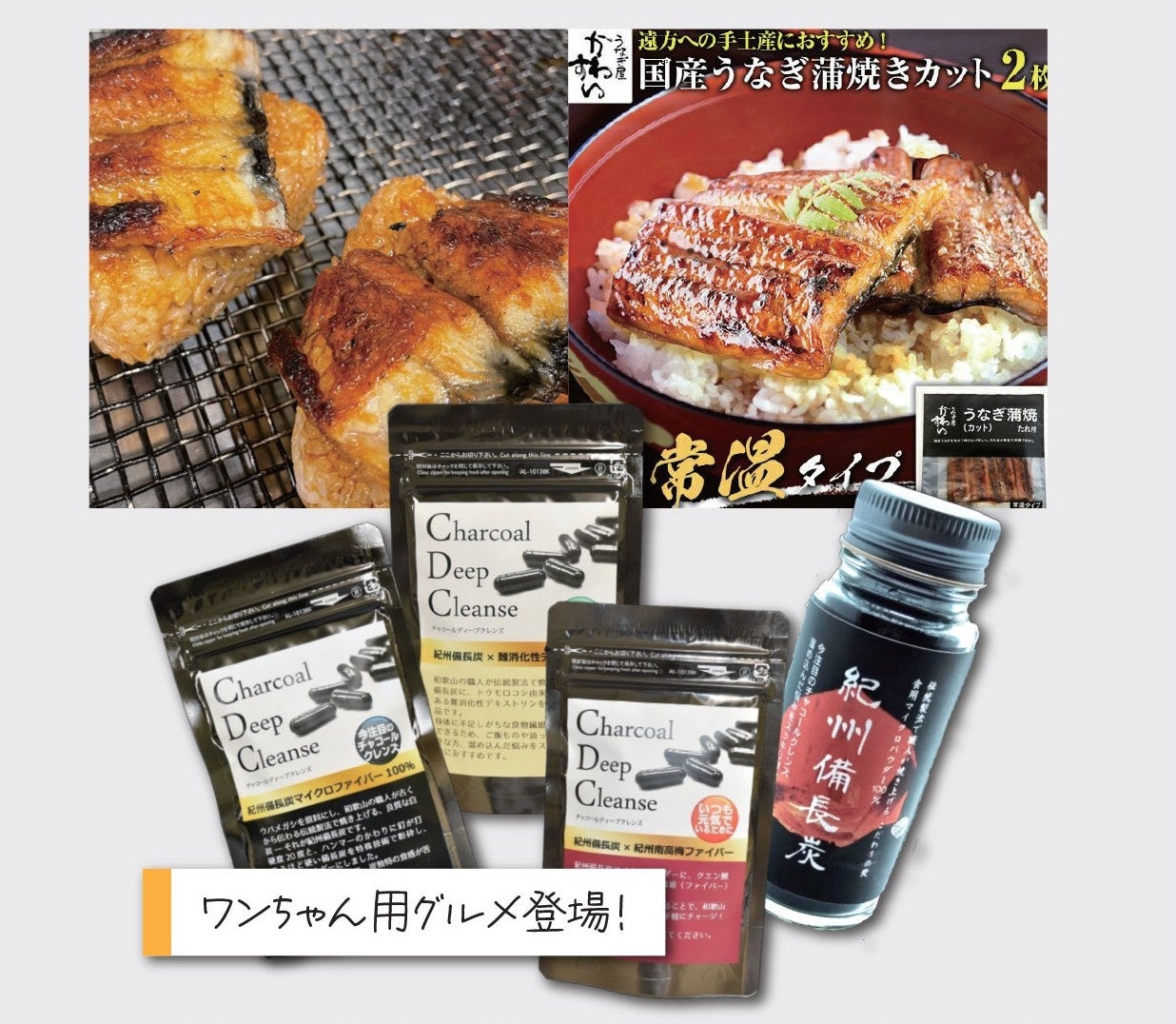 紀州備長炭を練り込んだ、ワンちゃんのためのクッキーや、国産うなぎの蒲焼・うなぎのアタマ(ワンちゃん用)を販売。