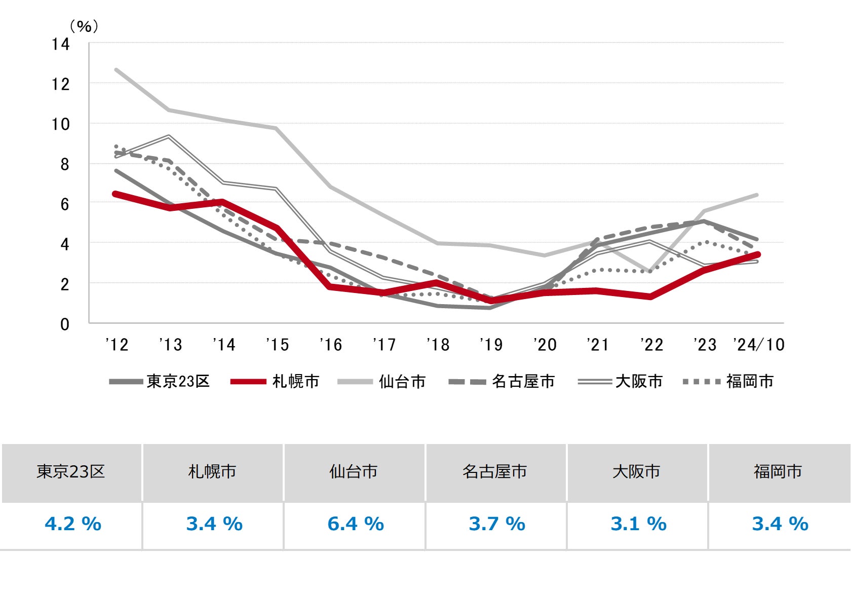 三幸エステート株式会社(本社:東京都中央区、取締役社長:武井重夫)は、2024年10月度の札幌市オフィス賃貸状況(空室率&現空面積:全規模、募集賃料&募集面積:全規模、規模別空室率、主要エリア※1空室率:全規模)および全国6大都市(東京・札幌・仙台・名古屋・大阪・福岡)の大規模ビルのマーケットデータをまとめた「オフィスマーケット2024年11月号札幌」を公表します。