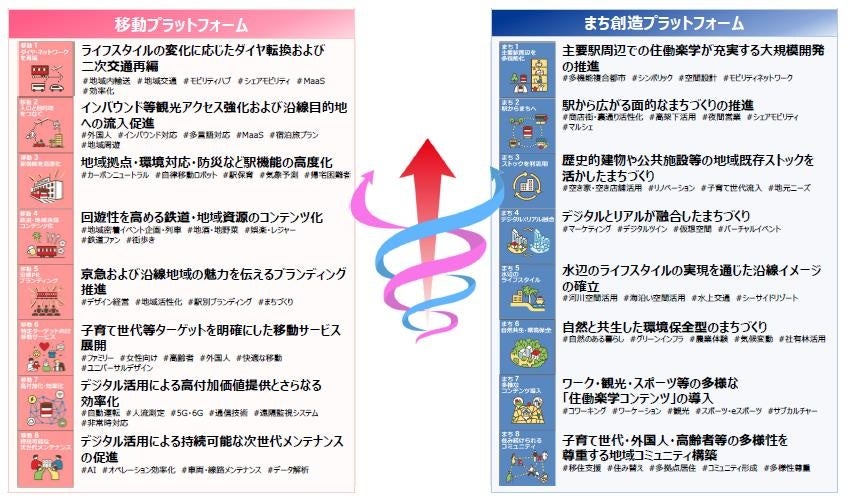 京急電鉄は,第 20 次総合経営計画の中で,「沿線価値共創戦略」として,あらゆる交通手段を用いた移動環境の最適化を行う【移動】と,都市機能の更新や生活支援を行う【まち創造】の2つのプラットフォームが織りなす相互価値共創のスパイラルアップにより,お客様が求める価値観を実現する「新しい価値」の創出を図り,持続的に発展する沿線の実現を掲げております。
