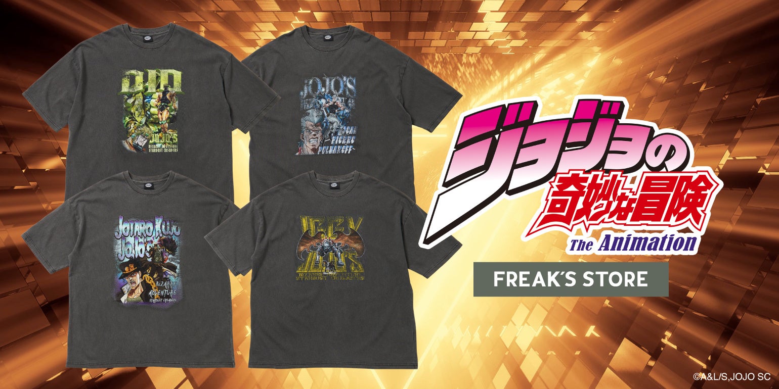 ジョジョの奇妙な冒険は、1987年より『週間少年ジャンプ』にて連載がスタートした荒木飛呂彦原作の大人気漫画。アニメ『ジョジョの奇妙な冒険 スターダストクルセイダース』は同作のアニメシリーズの3作目として2014年4月より放送された人気作で、この度、FREAK'S STOREとのコラボレーションが実現!