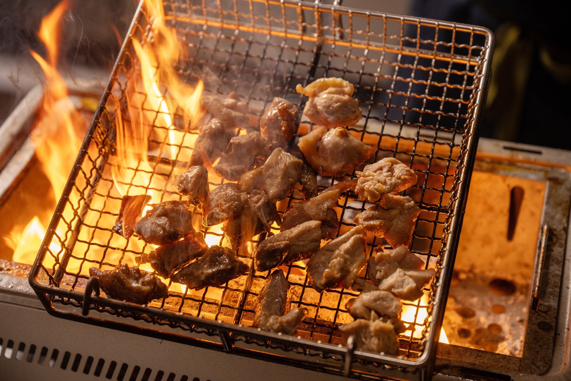 目の前で炙る鹿児島若鶏の炭火焼やかつおの藁焼き、揚げたての黒豚とんかつやさつま揚げ。地元酒造の芋焼酎やウィスキーも充実。