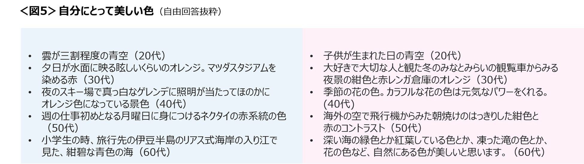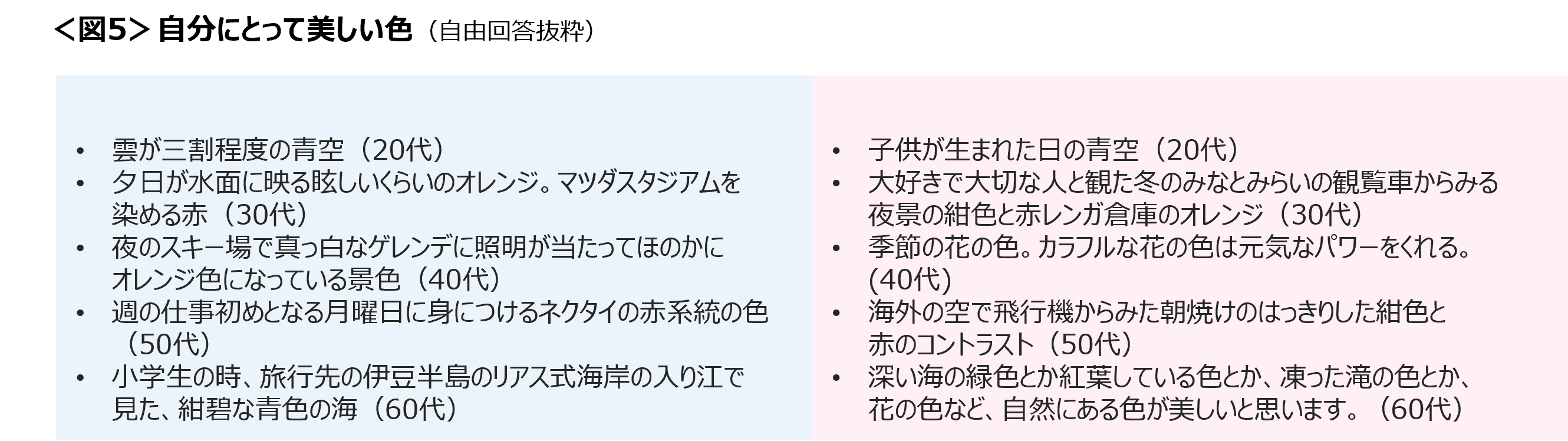 自分にとって美しい色は、思い出の日に見た景色の色や、花や雪などの自然にある色などがあげられた。また、「自分がきれいだと思う色を身に着けて元気を出す」という回答もみられた。<図5>