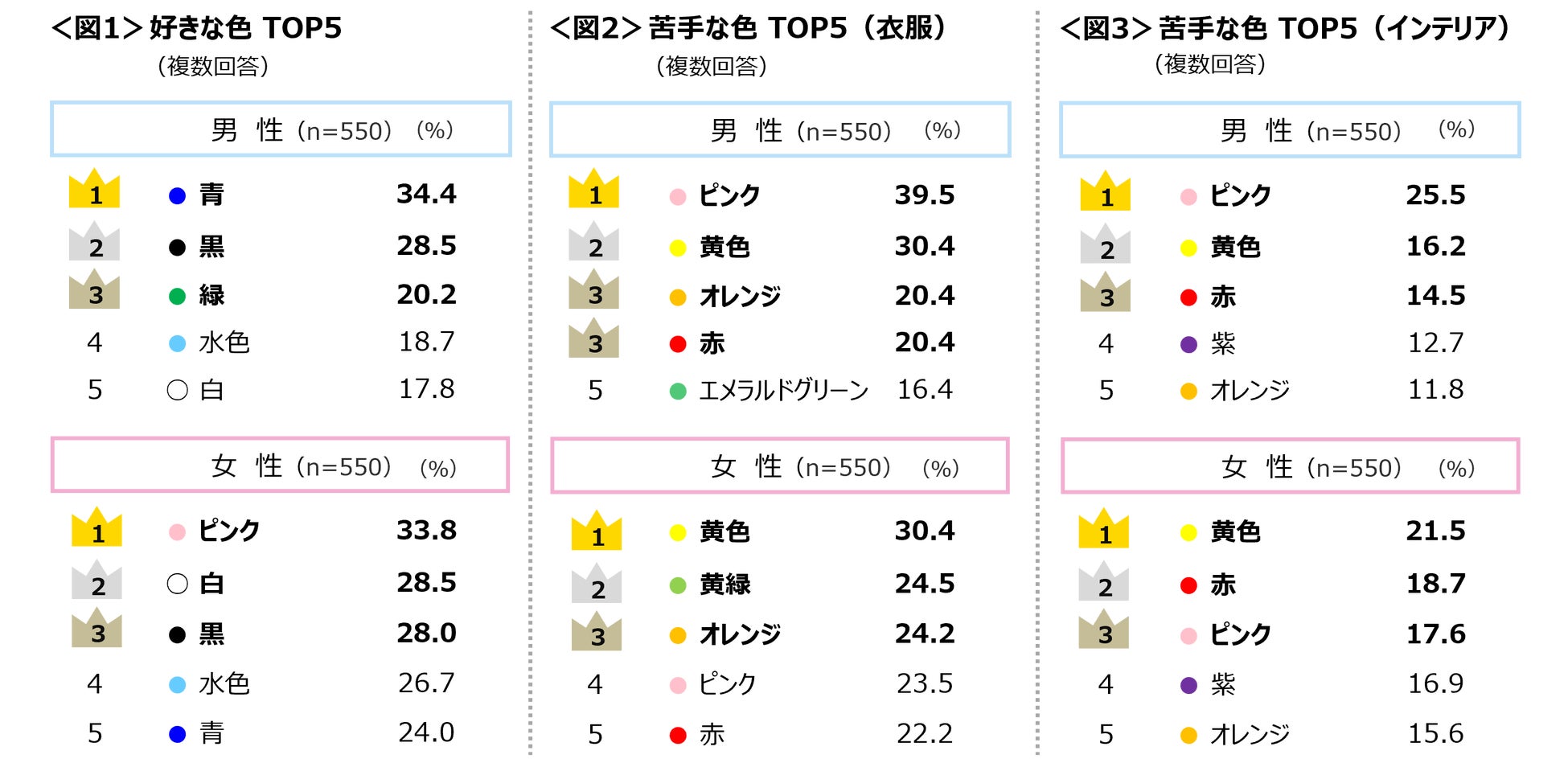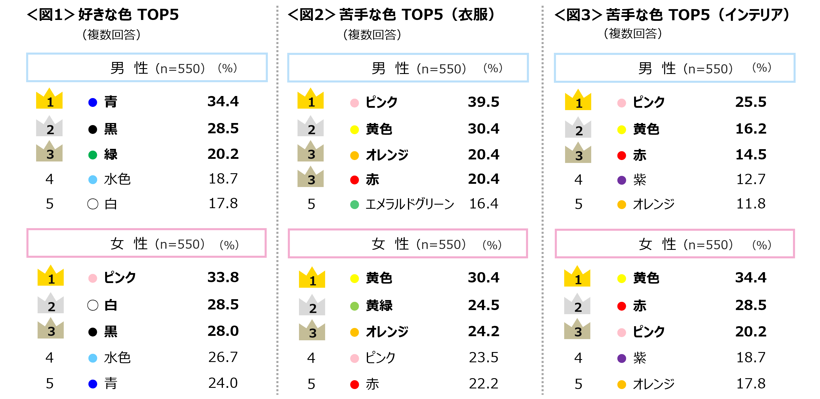 該当箇所<図3>苦手な色 TOP5(インテリア)の数表、女性においてTOP5の数値が間違っておりました。画像は訂正して差し替え済みです。ご迷惑をおかけしてしまい申し訳ございませんでした。なお、順位の訂正はございません。