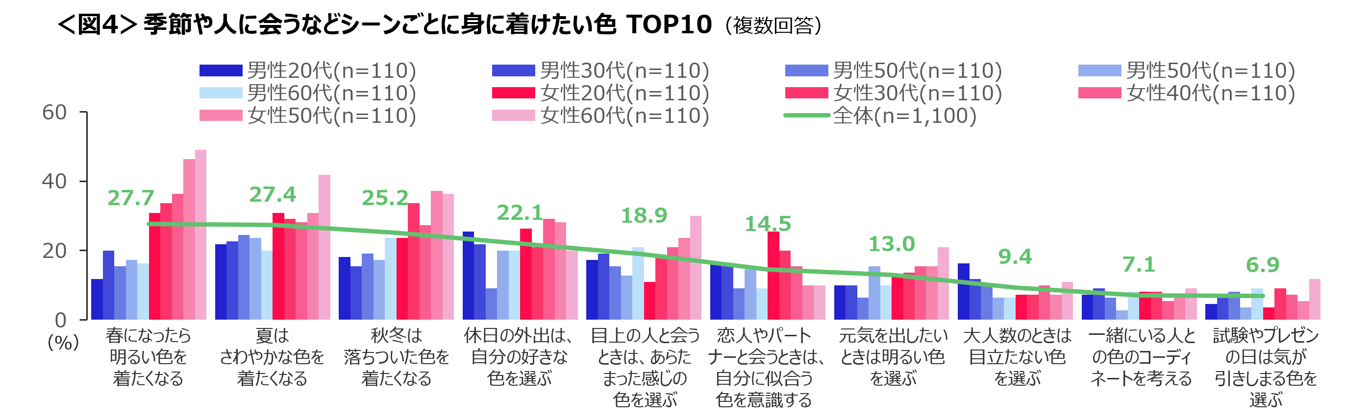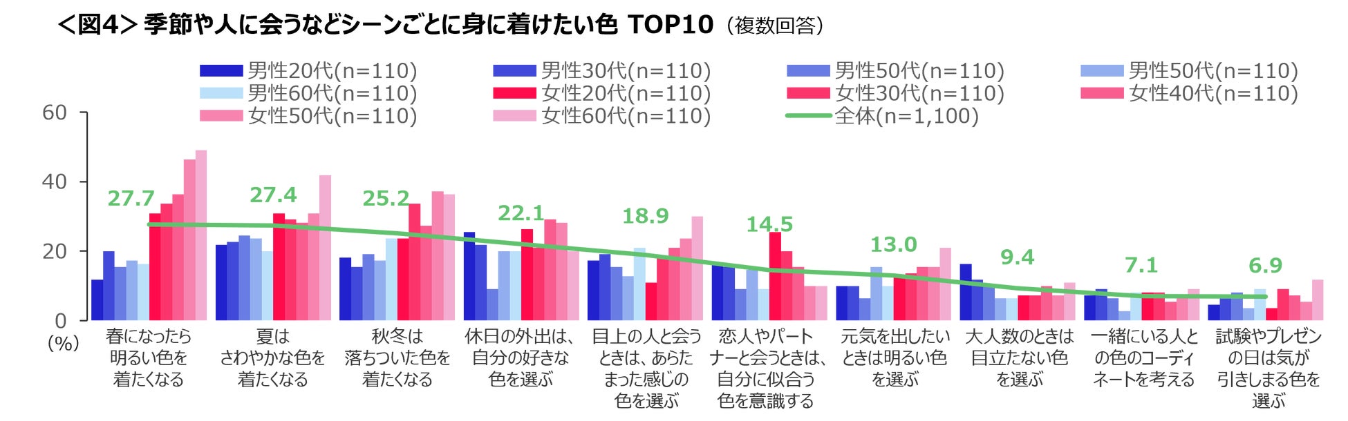女性50代・60代では「春になったら明るい色」「秋冬は落ちついた色」「目上の人と会うときは、あらたまった感じの色」などが高く、シチュエーションに応じて身に着けたい色を選択している様子。<図4>