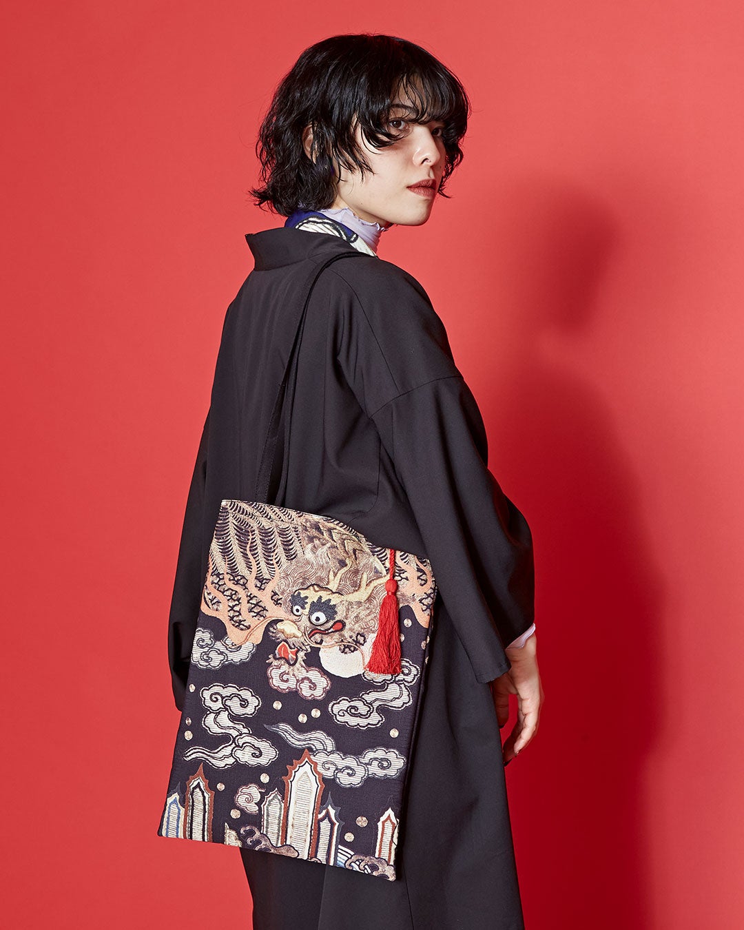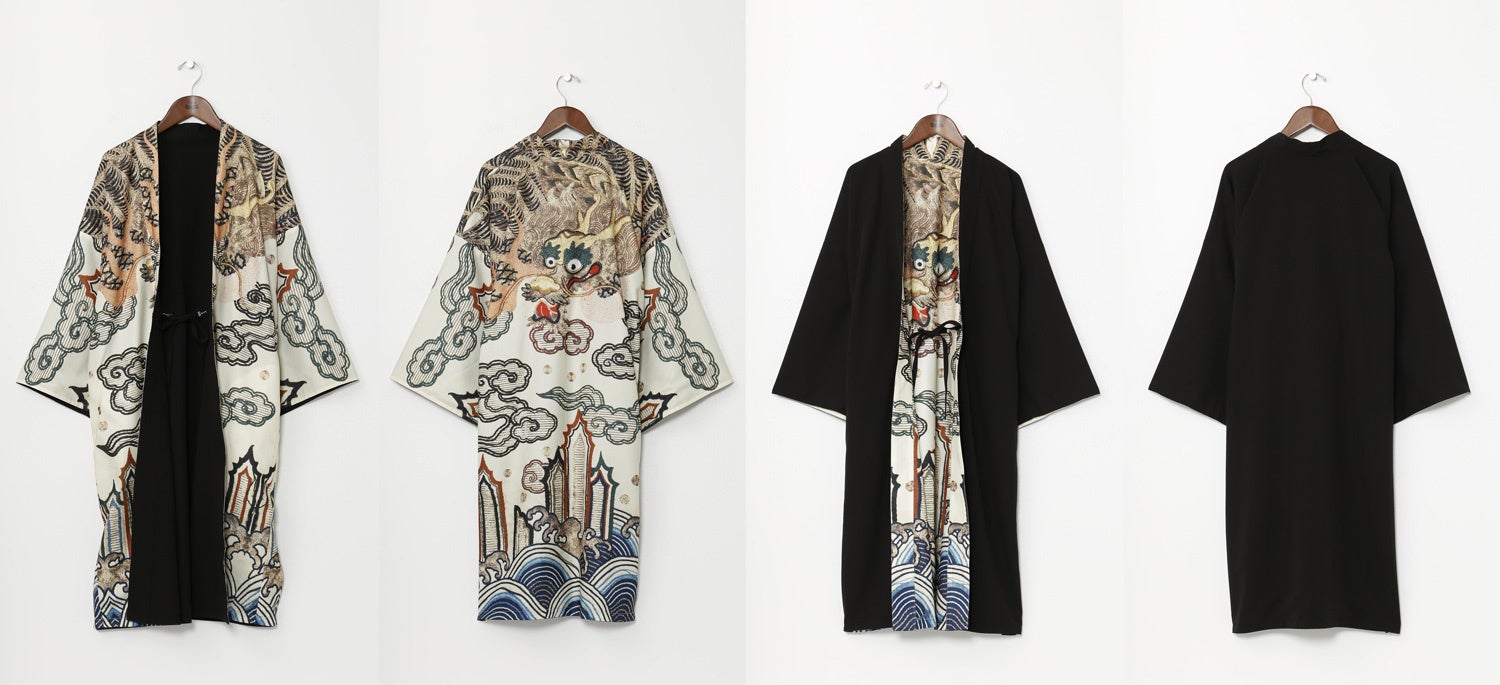 今回のコラボレーションアパレルは、東京国立博物館所蔵の染織資料「着付 白呉絽地龍波濤模様(きつけ しろごろじ りゅうはとうもよう)」をもとに、現代のファッションとして再解釈したシリーズです。