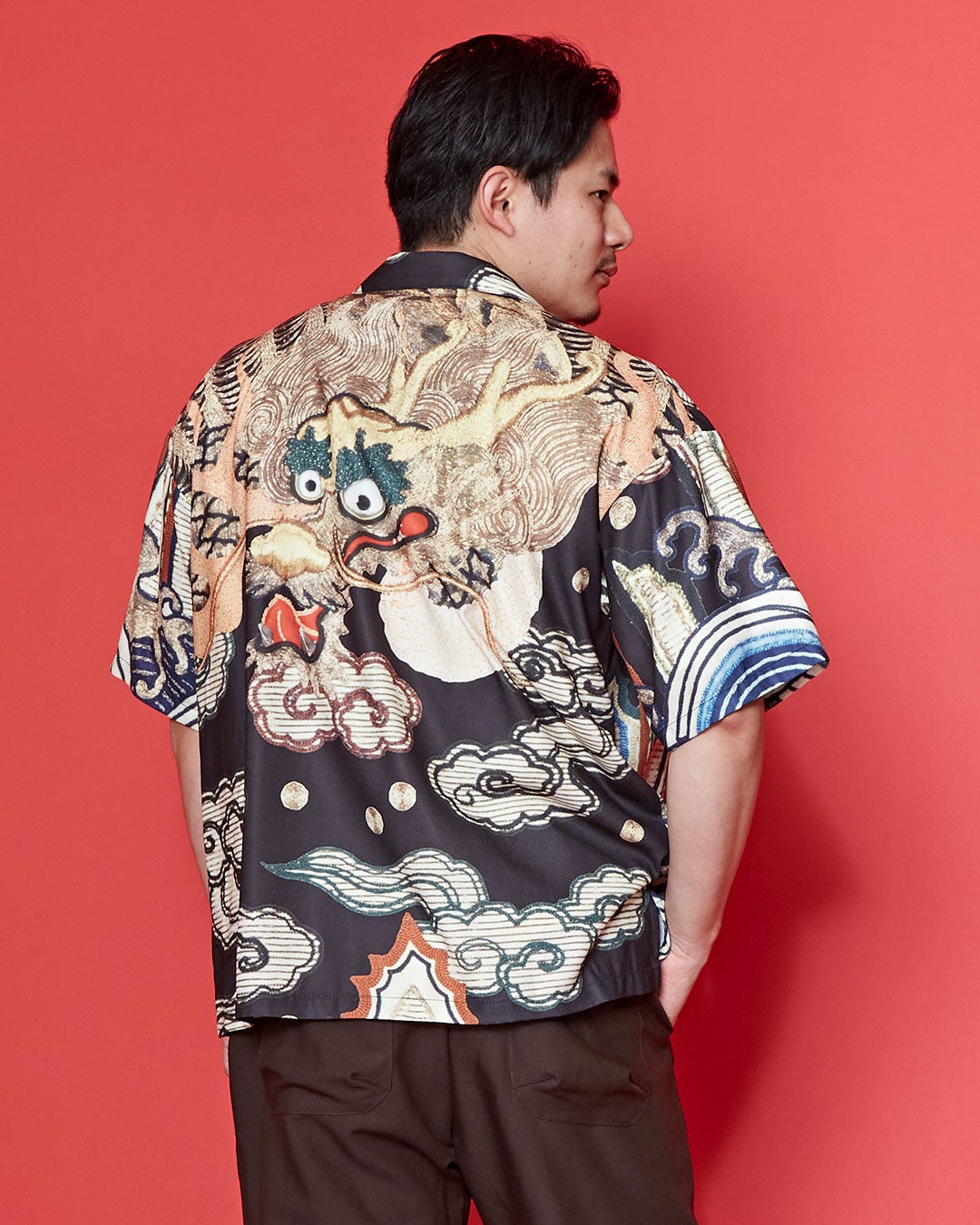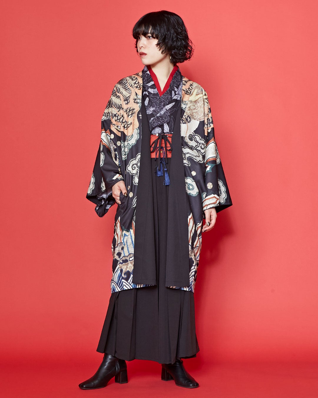 着物のようなロングシルエットが特徴の羽織は、力強い龍柄とシンプルな無地の両面を楽しめるリバーシブル仕様。装いや気分に合わせて着回しができ、シーンを問わず活躍します。ゆったりとしたサイズ感で、男女問わず着用していただけるユニセックスデザインです。