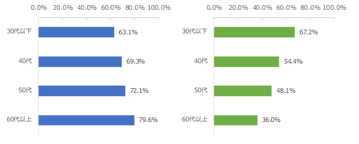 【年代】20代以下:2.2%、30代:8.8%、40代:23.3%、50代:36.0%、60代以上:29.6%