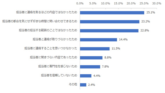 「特定の担当者はいるが、カスタマーサポートに問い合わせをする前に相談をしなかった」と回答した人に対し、担当者に連絡をしなかった理由を調査したところ、「担当者に連絡を取るほどの内容ではなかったため」(25.1%)が最も高く、次いで「担当者の都合を気にせず好きな時間に問い合わせできるため」(23.2%)、「担当者の担当する範囲のことではなかったため」(22.8%)が続きました。