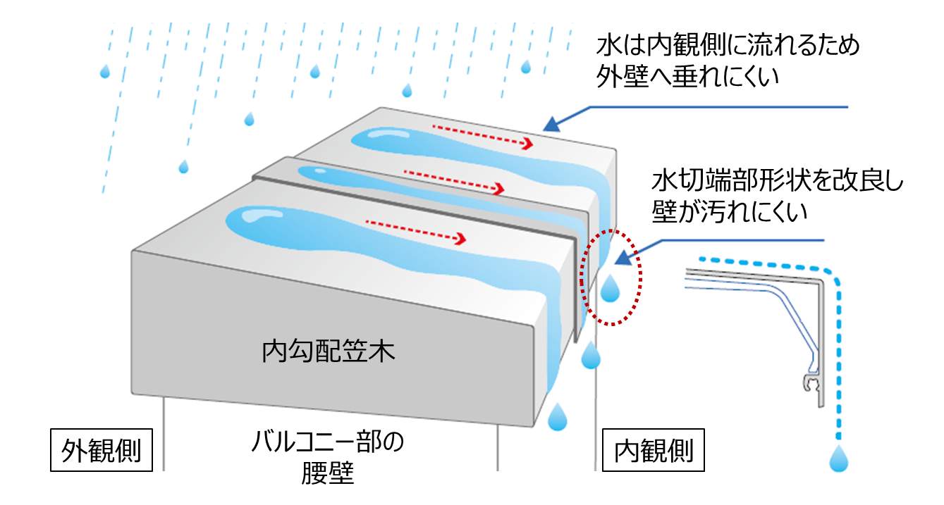 笠木の端部から流れる雨水が壁を伝わりにくい水切り形状へ改良。流れ落ちる雨水が垂直に落下する形状とすることで、雨垂れによる外壁汚れが発生しにくくなるように配慮し、住宅の外観意匠を美しく保つことができます。