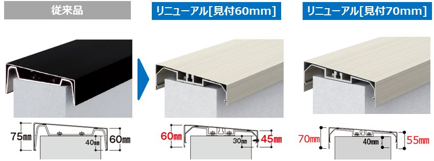 外壁側の見付寸法を75mmから60mmにスリム化しました。それにより、外壁上部の笠木部分がよりすっきりとした印象となり、幅広い外観デザインにマッチする意匠となっています。また、笠木の勾配形状を見直し、躯体との十分な掛かり寸法を確保しています。さらに、従来仕様の見付寸法に近い70mmタイプも設定。物件での納まりに合わせて笠木を使い分けることが可能なラインアップとしています。
