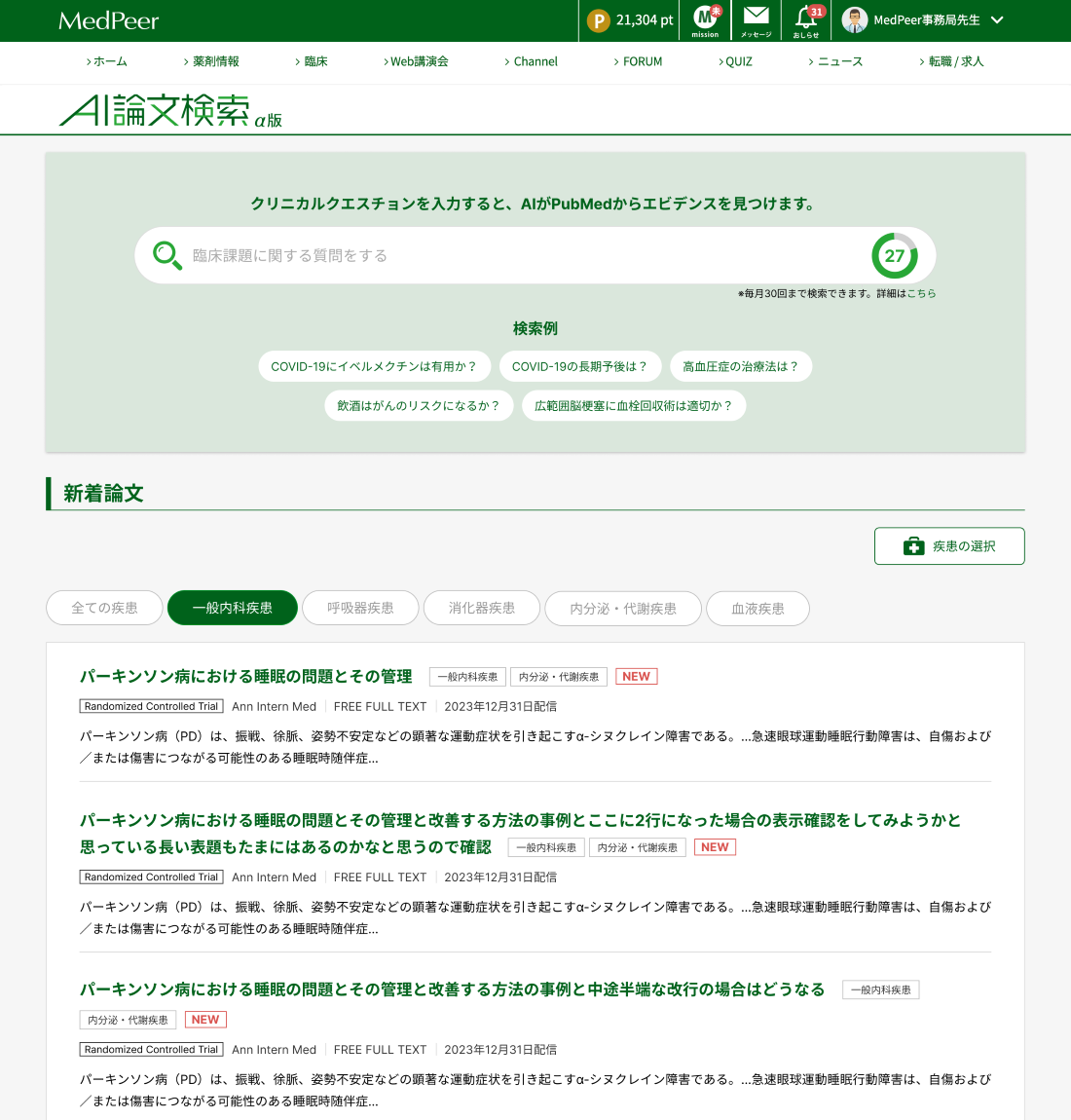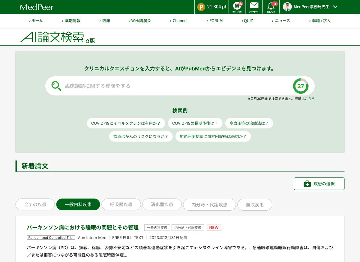 「AI論文検索」は、「MedPeer」の医師会員であれば誰でも無料で利用可能、生成AIを用いて臨床課題解決のためのエビデンス(論文)検索にかかる時間と手間を削減できます。