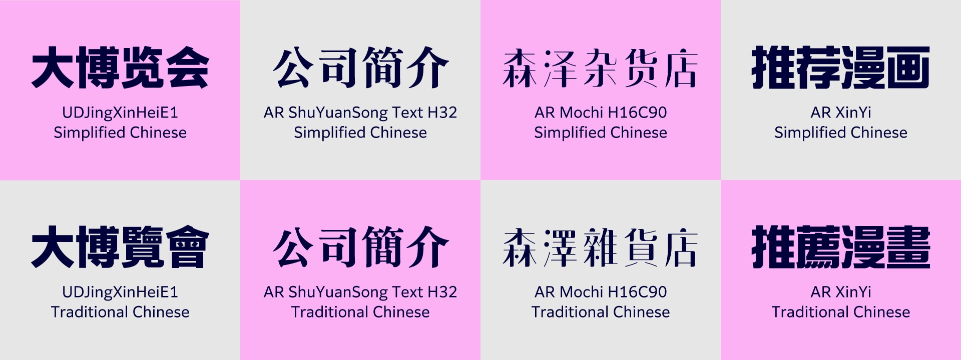 2022年にモリサワグループの一員となった、台湾を代表するフォントメーカーArphic Typesからは、中国語の表現がより豊かになる簡体字・繁体字書体ラインナップを追加します。シンプルで可読性の高いユニバーサルデザイン(UD)書体「AR UDJingxiheiE1(アーフィックユーディージンシーヘイイーイチ)」や、柔らかくも力強い印象の「AR ShuYuanSong(アーフィックスーユェンソン) Text H32」などArphic Typesの代表書体が仲間入りします。また、温かみとリズミカルな動きを表現した「AR Mochi(アーフィックモチ) H16C90」や、近未来的な雰囲気の「AR Xinyi(アーフィックシンイー)」は、翠流(すいりゅう)シリーズのベースとなった書体です。和文書体「翠流きら星」や「翠流アトラス」などと合わせて使うことにより、日本語と中国語の両方を必要とする場面でデザインの統一感が生まれます。