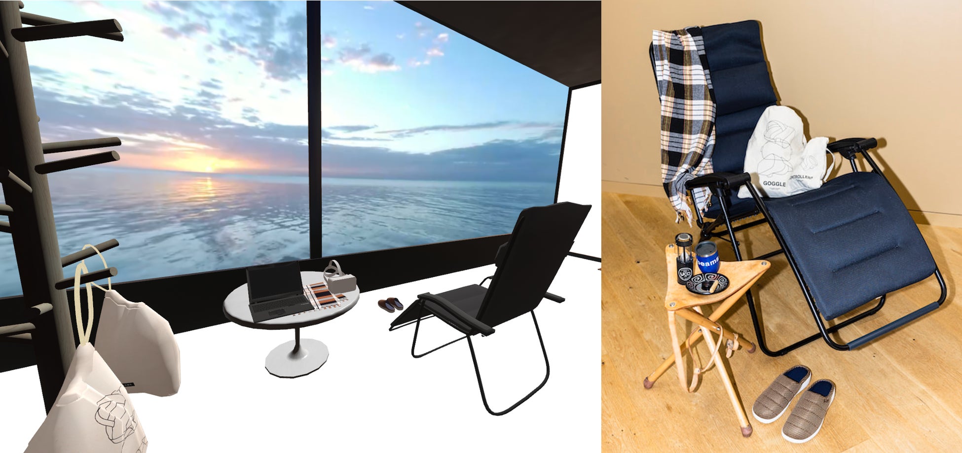 ショップ1階奥の部屋は、VRが身近にあるライフスタイルを想像してbPr BEAMSの商品をキュレーションした空間です。ここに並ぶインテリア雑貨のほとんどが、BEAMS公式オンラインショップや店頭で購入可能です。
