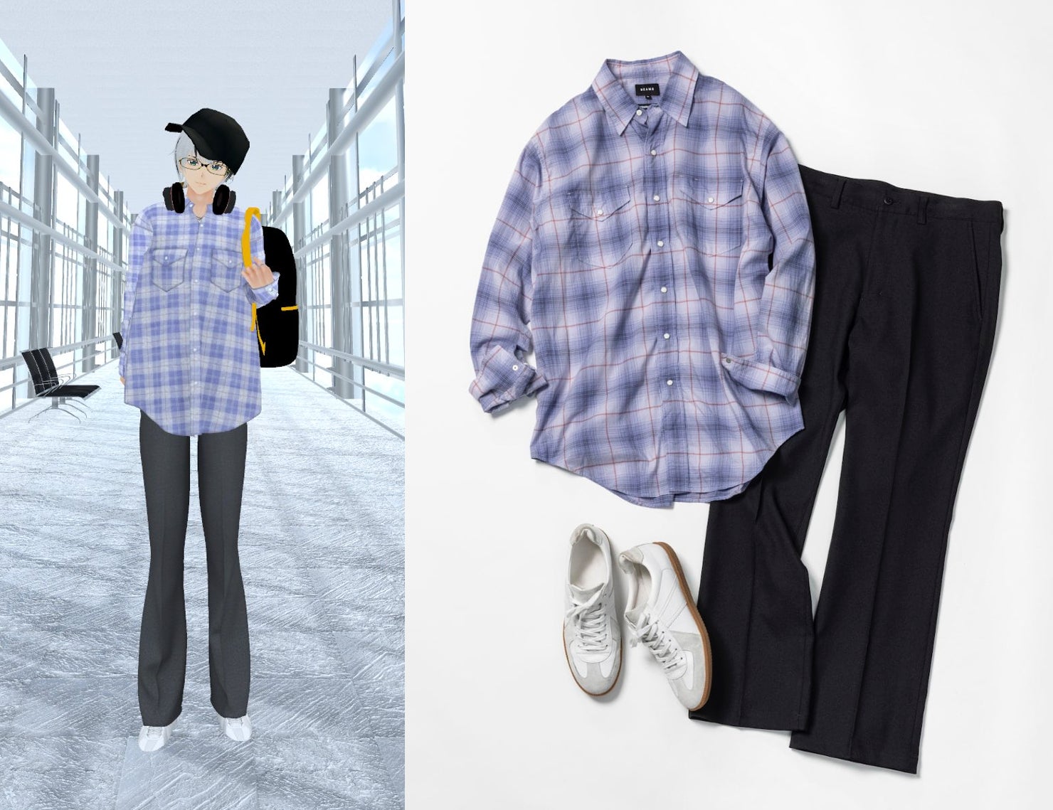 今回バーチャルショップ1階では、BEAMSの2022年秋冬商品を3Dモデルに起こしたデジタル商品を、アバターが着用する衣装として、合計7種を販売しています。ワンピース、ベスト、ロングスカート+ミュール、ウェスタンシャツ、パンツ+スニーカーに加え、BEAMSロゴ入りTシャツとスウェットシャツの3Dモデリングは、アバター用衣装の制作を手掛けるSELECT SHOP -Cornet-(こるねっと)によるものです。これら商品を、人気アバター「桔梗」(ポンデロニウム研究所)、「ウルフェリア」(ひゅうがなつ)、「碼希」(同)に着せてディスプレイし、さらに商品単体をワンクリックでユーザーのアバターが試着できる機能も実装しています。