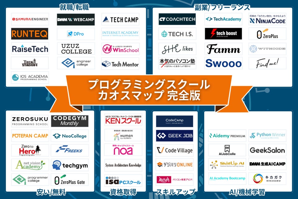 本カオスマップは、プログラミングスクールへの通学を検討している方が、学習目的や希望のキャリアに合わせて最適なスクールを選びやすくなるよう作成しました。