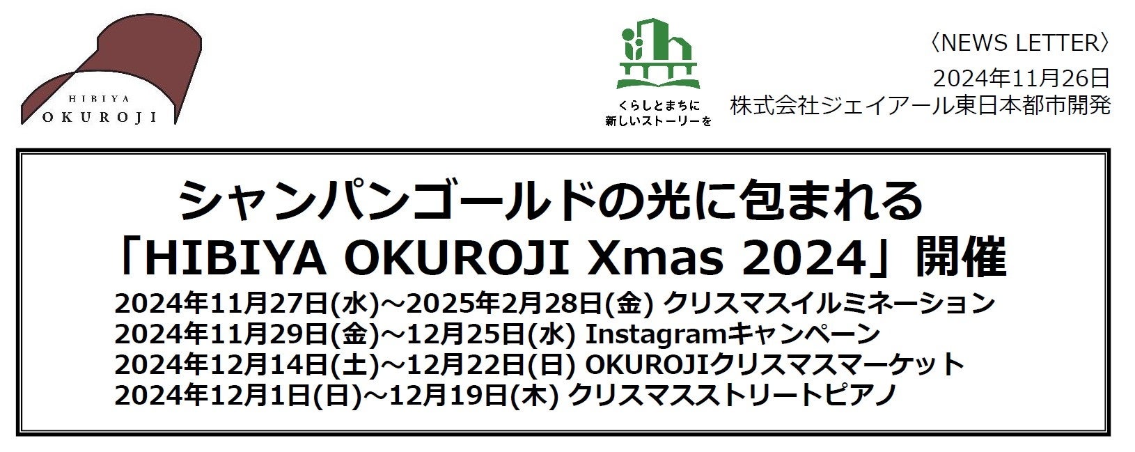 日比谷OKUROJIでは、クリスマスシーズンを華やかに彩る「HIBIYA OKUROJI Xmas 2024」を開催いたします。今年はシャンパンゴールドのイルミネーションをはじめ、Instagramキャンペーン、クリスマスマーケット、ストリートピアノなど、多彩な企画をご用意。心躍る冬のひとときをお楽しみください。