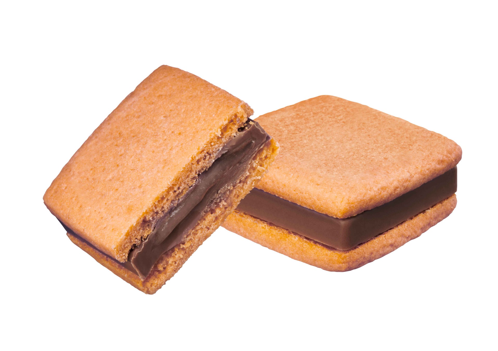 ヘーゼルナッツプラリネペーストとフィアンティーヌを丁寧に練りこんだミルクチョコレートガナッシュをアーモンドが香ばしいサブレでサンドしました。ガナッシュのザクザクとした食感とホロホロとほどけるサブレの絶妙な味わいです。