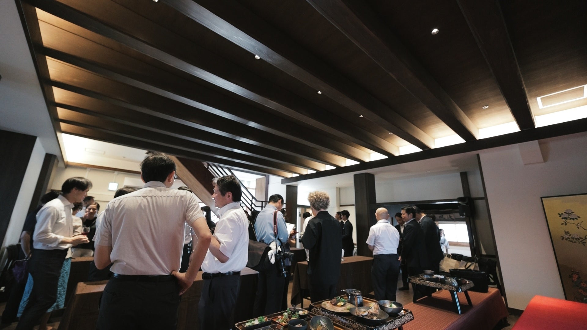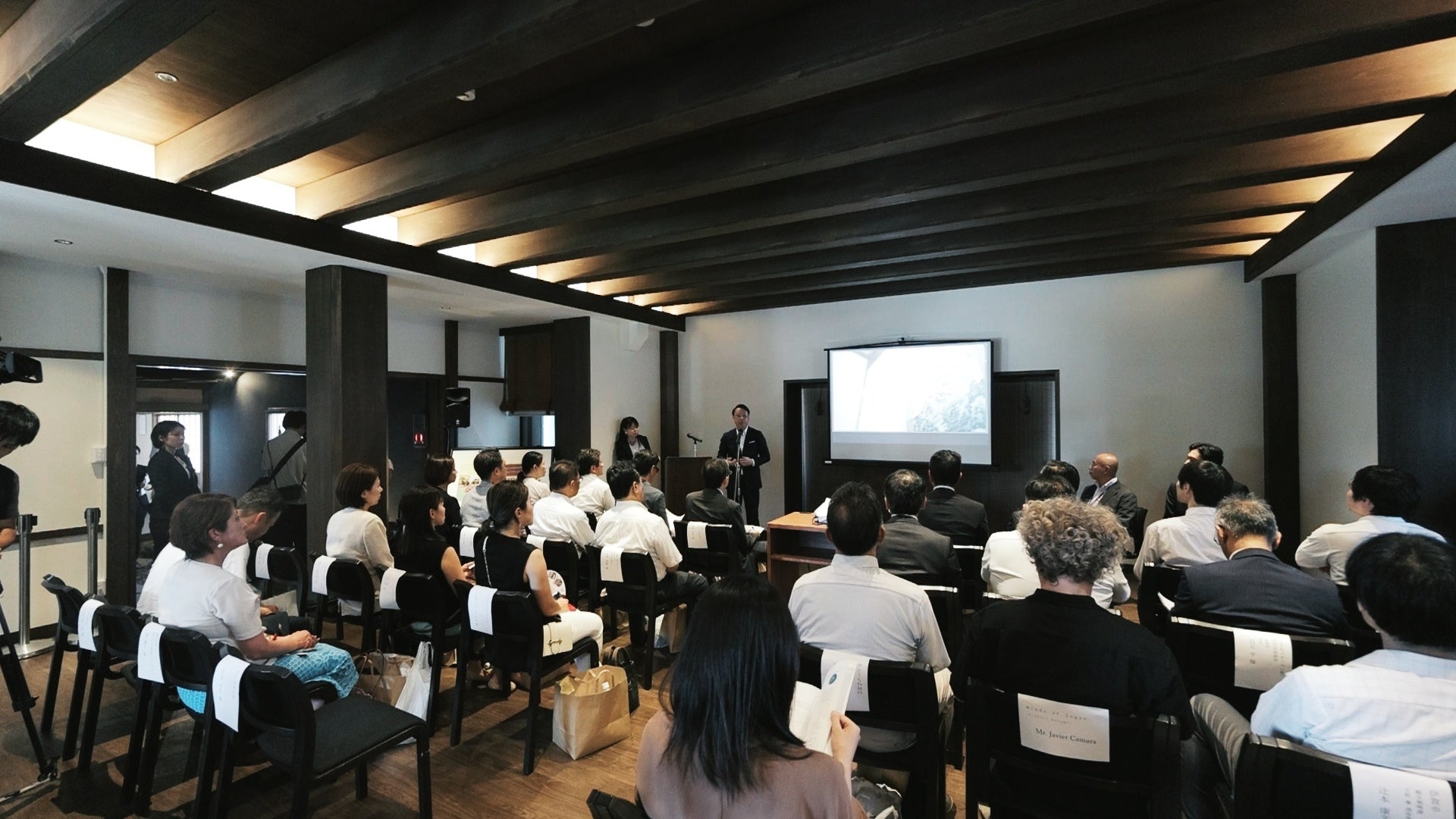 オープンレセプションは、月見櫓で開催。事業主体である公益財団法人ふくやま芸術文化財団と運営事業者であるバリューマネジメント株式会社の各代表からの挨拶、そして来賓として福山市からの挨拶。挨拶の後に、招待された海外エージェント向けに本城泊事業のプレゼンテーションを実施しました。