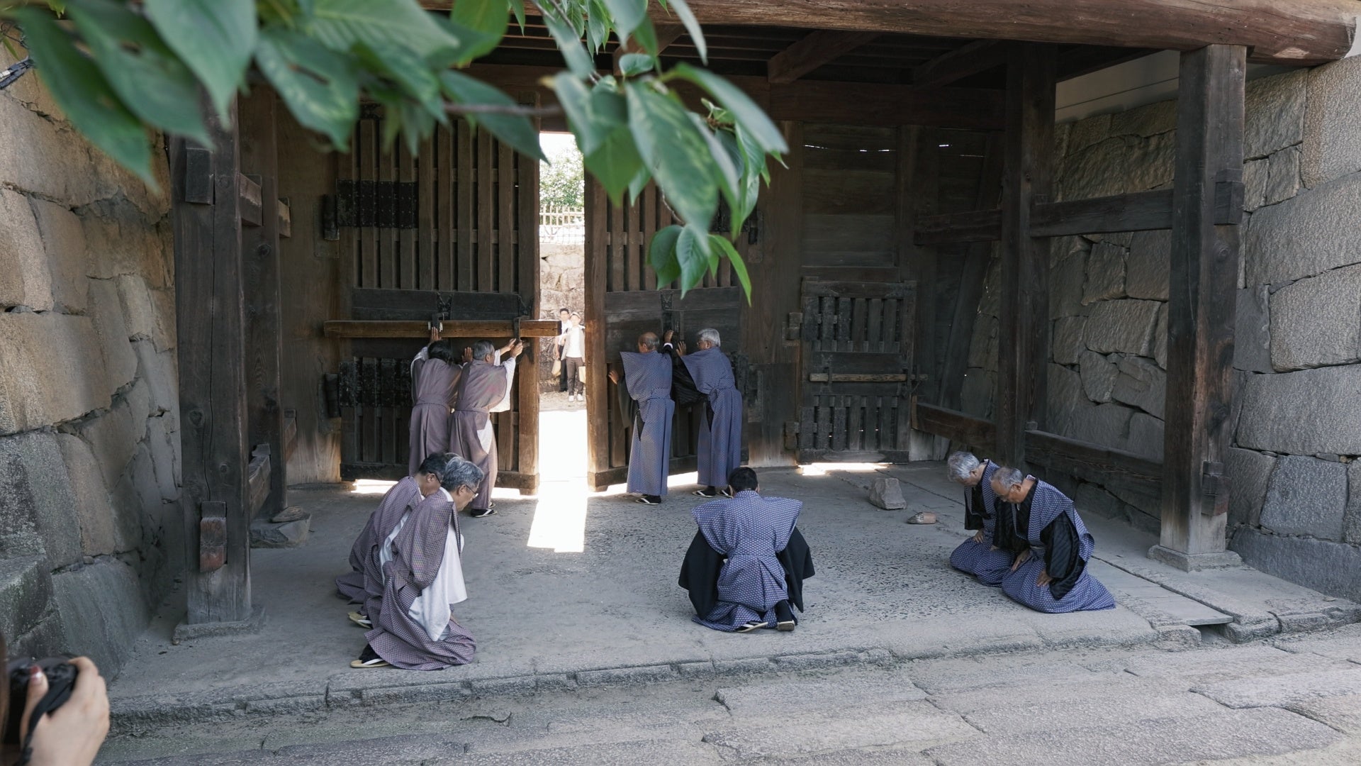 当日は国登録有形文化財 福寿会館で福山城の天守と日本庭園を眺めながらお過ごしいただいた後、国重要文化財 筋鉄御門へご案内し、福山城キャッスルステイのコンテンツである、入城体験を体験いただきました。「殿の御成」の号令とともに響く太鼓に合わせ、筋鉄御門の大きく重い扉が開くと、裃姿の11名の家臣が頭を下げて迎え入れます。家臣に扮するのは、地元ボランティアガイド。福山城を愛する人々が入城シーンを盛り上げます。その後はオープンレセプション会場に。