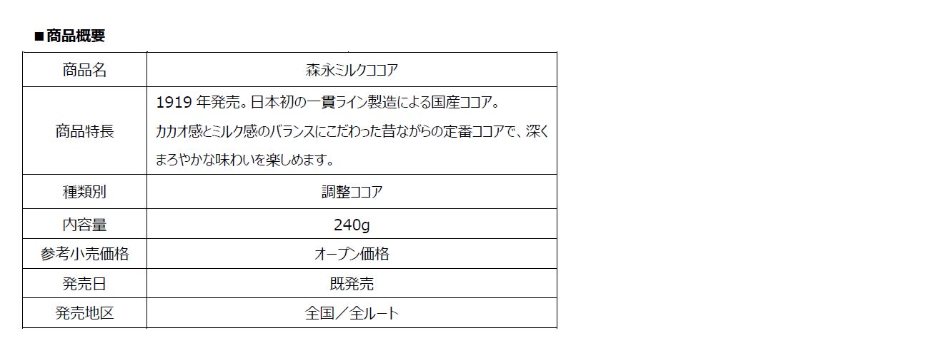 1919年に発売開始したロングセラーブランド「森永ミルクココア」は、カカオ感とミルク感のバランスにこだわった昔ながらの定番ココアです。家族団らんの時、落ち着きたい時など様々なシーンでお楽しみいただいています。