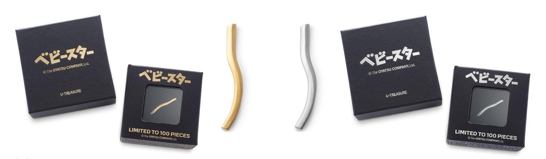 2023年に65本限定で初登場して即完売した”純金”のベビースター。その人気を受けて、”あなたの好きをカタチに…”とファンの方々の「好き」をジュエリーというカタチにしている大人のキャラクタージュエリーブランド『ユートレジャー』とのコラボが再び実現!今年は、ちぢれ方も長さも1本1本異なる個性的な形のベビースターに合わせ、カタチを変えた“純金製”に加えて、“純プラチナ製”のベビースター2種類が登場。