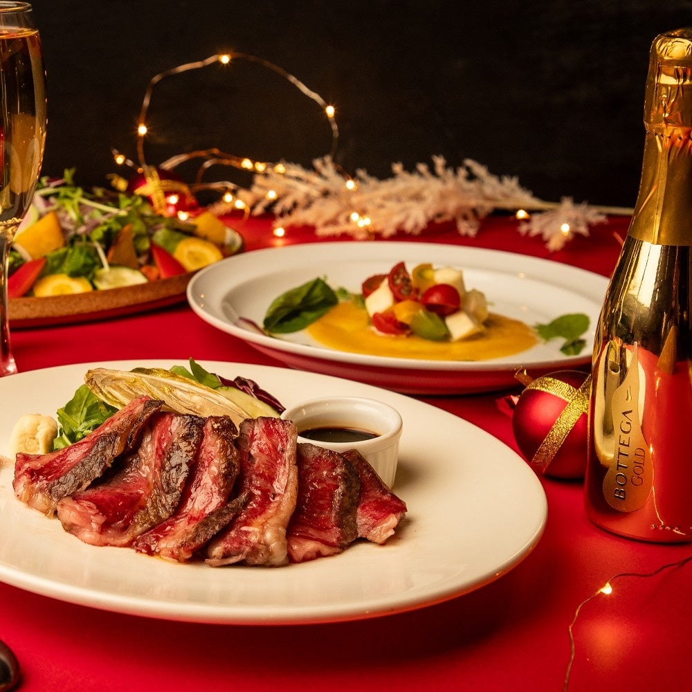 【Xmas12/23~25限定】特別な夜を楽しむクリスマス~乾杯スパークリング付・国産サーロインのタリアータや白糠産フレッシュモッツァレラ・Xmasデザートなど全9品≪2時間飲み放題付≫ 7,000円