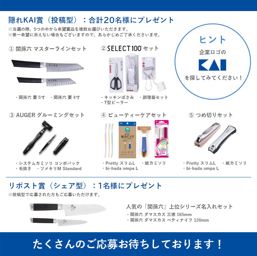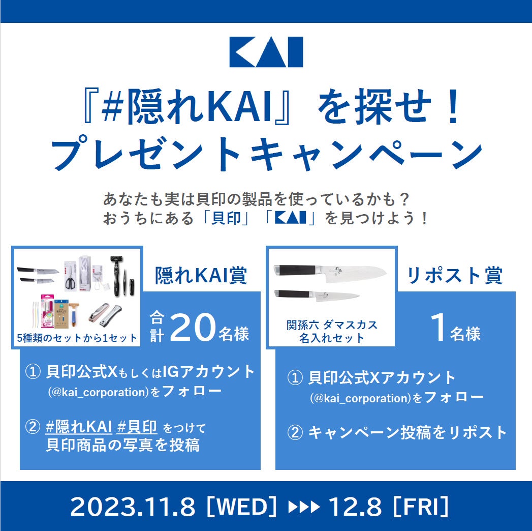 貝印公式SNSアカウントをフォローし、ご家庭にある貝印商品の写真を投稿、または公式SNS投稿をシェアすると商品が当たる「『#隠れKAI』を探せ!キャンペーン」を、11月8日(水)~12月8日(金)まで開催いたします。