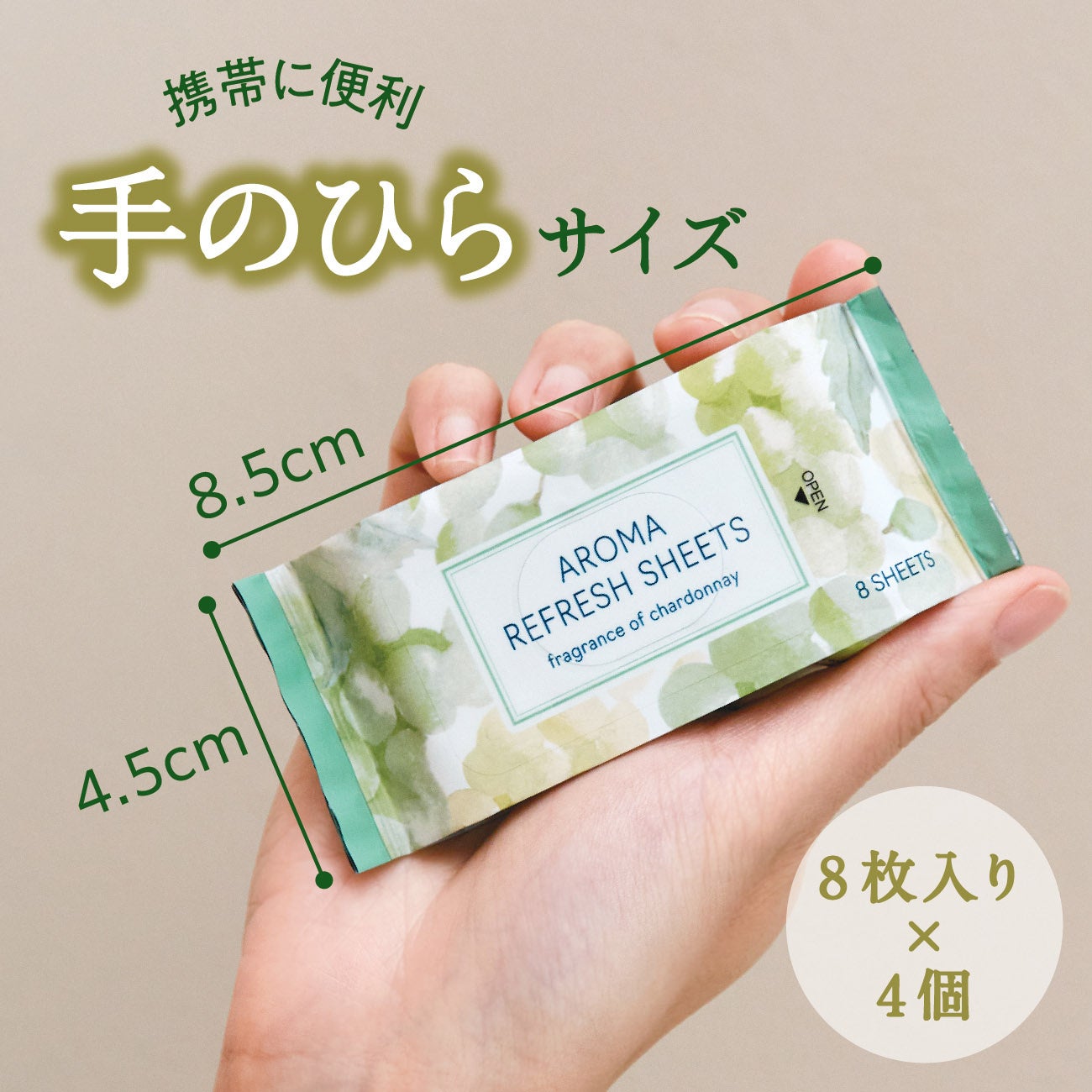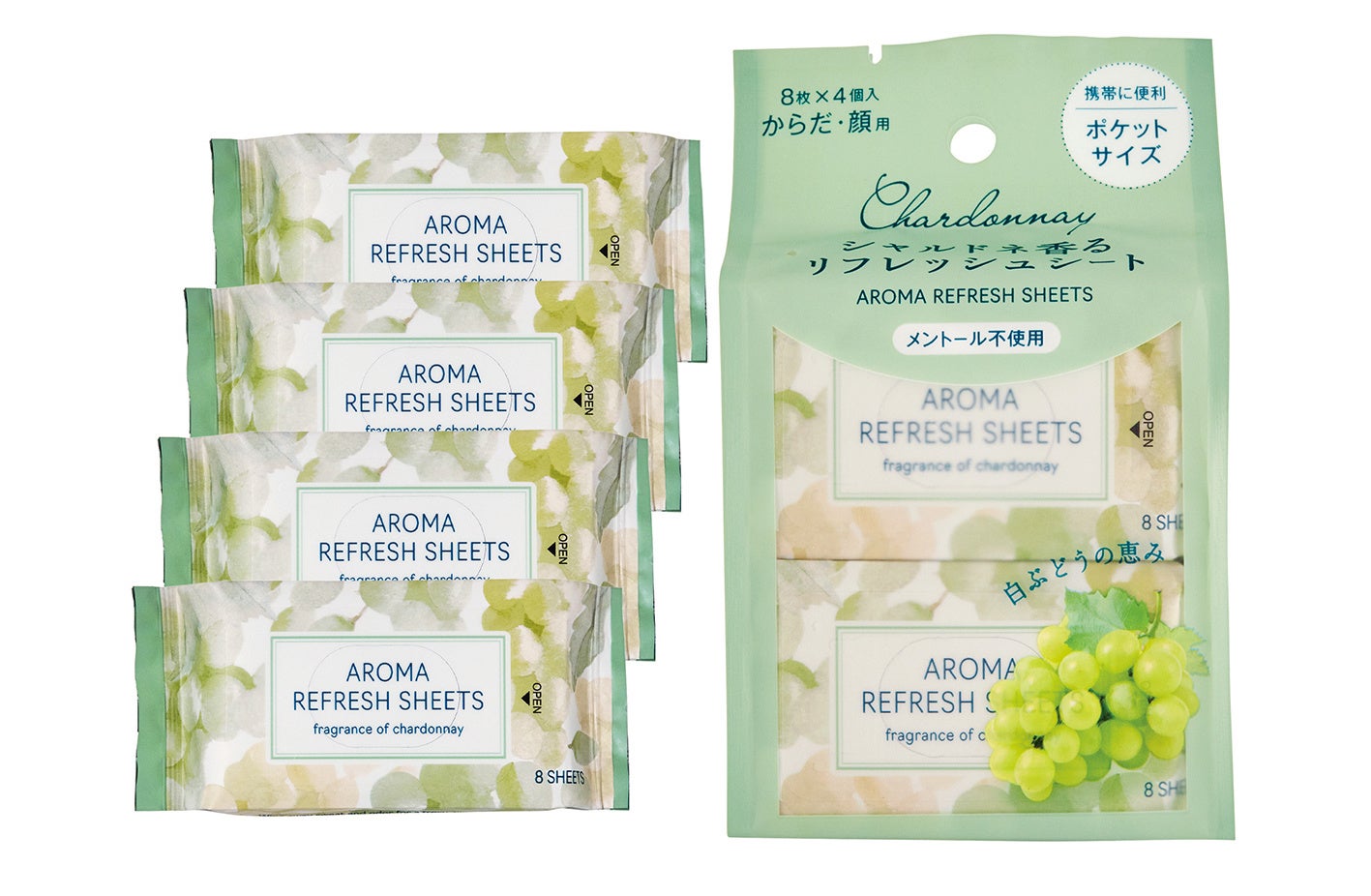 爽やかなシャルドネの香りがふんわりと広がる、ひんやりタイプの汗拭きシート。