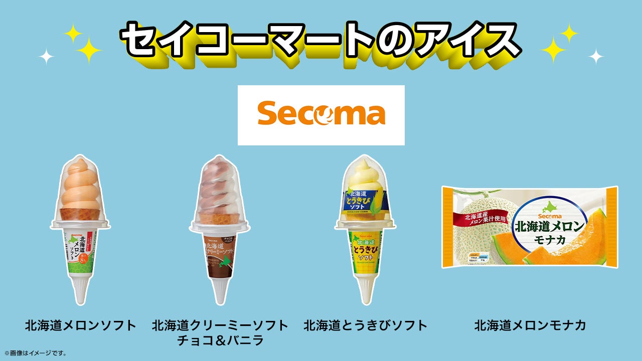 また、7月31日(水)から、北海道のご当地コンビニ「セイコーマート」で人気のオリジナルアイス「北海道メロンソフト」や「北海道とうきびソフト」などの4種類を、ローソンストア100でも数量限定にて販売いたします。