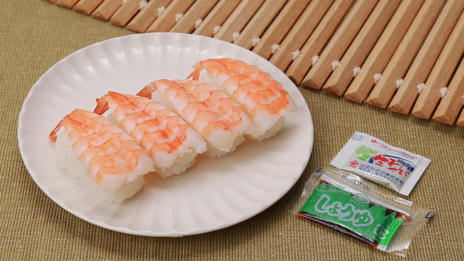 人気の寿司ネタ、ほどよい甘みが特長の「海老」を4貫つめた小型寿司パックです。