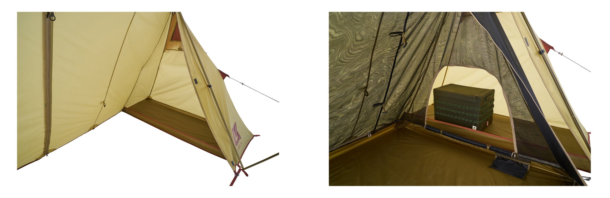 テントの両サイドには、荷物を置くのに便利なスペースがあるため、荷物が多いキャンプでも広々とした居住スペースを確保できます。インナーテントの左右には小さな窓があるので、テント室内から荷物の出し入れが可能です。