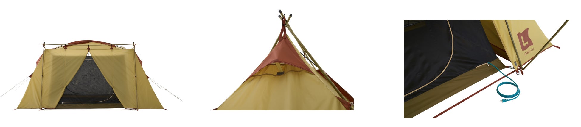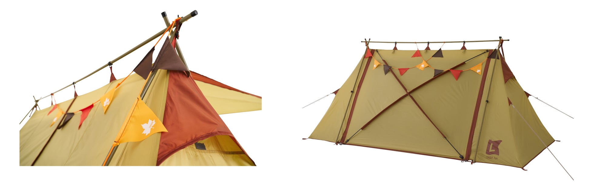 クラシカルなA型フレーム採用のほか、LOGOS独自のPANEL SYSTEMを搭載しており、テントの前面を2本のキャノピーポールで支えるとタープとして簡単に自立します。また、PANELルーフが筋交いかつ湾曲した構造のため、フルクローズ時の強度に優れるうえ、オープン時に雨水が溜まる心配もなく、ランタンの吊り下げも可能です。