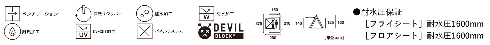 性能/特長:[フライシート]防水加工、撥水加工、難燃加工、UV-CUT加工、PANEL SYSTEM、バックドア、荷室スペース、回転式ジッパー[インナーテント]デビルブロックST、電気コードジップ、回転式ジッパー