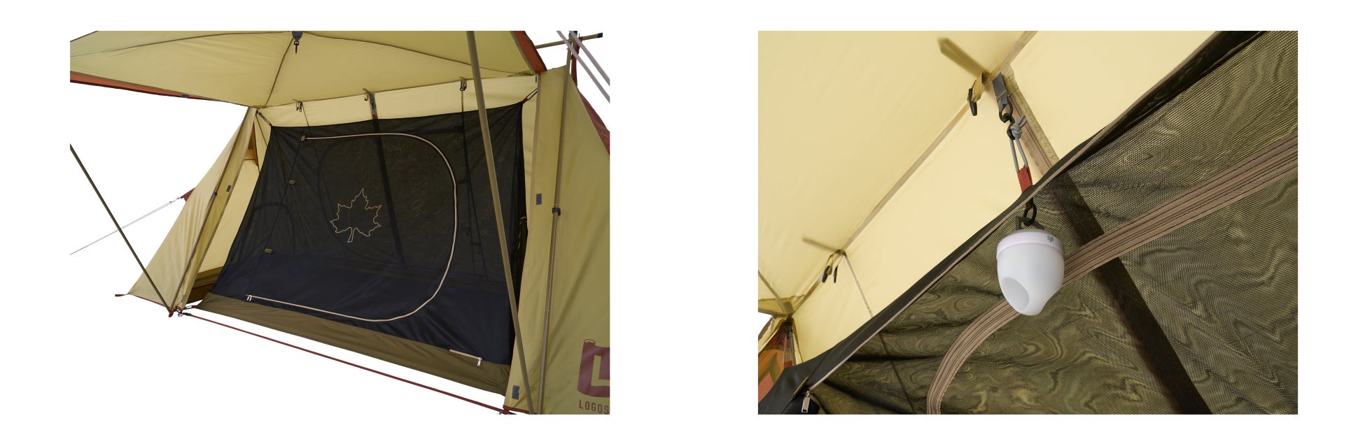フルメッシュのインナーテントが付属しており、生地にはLOGOS独自開発の高機能メッシュ「デビルブロックST」を採用しています。UV-CUT率・遮光率は通常比の約1.5倍を実現します。紫外線や強い日差し、虫の侵入を防ぎながらテント内部に心地よい風だけを通すので、快適に過ごすことができます。また、インナーテントに付いているOリングにランタンの吊り下げも可能です。さらに、インナーテントは簡単に取り外せる吊り下げ式なので、取り外せばタープとしても簡単に使用することができます。