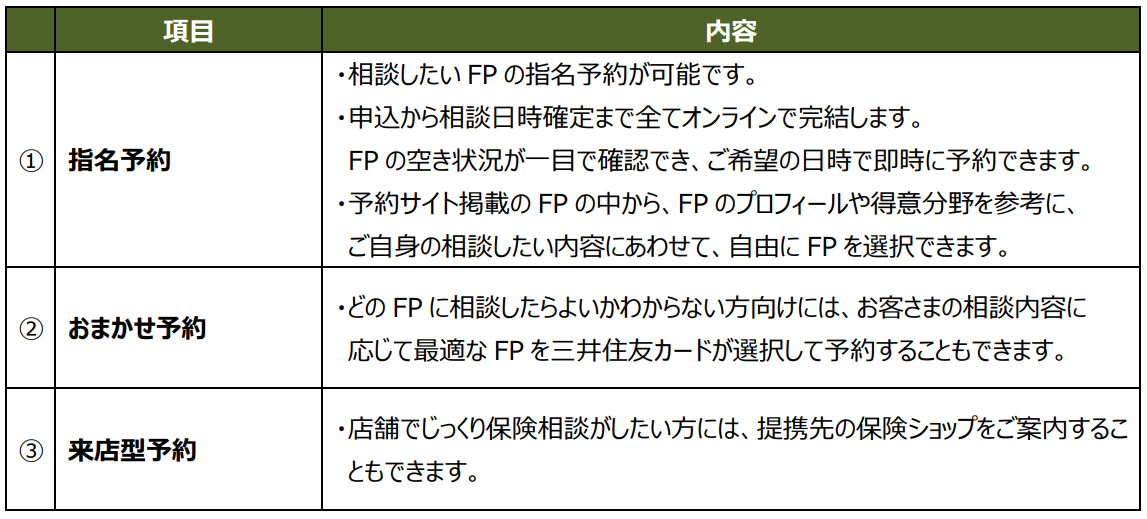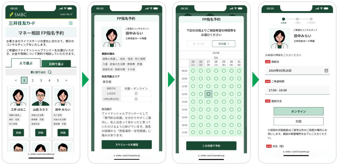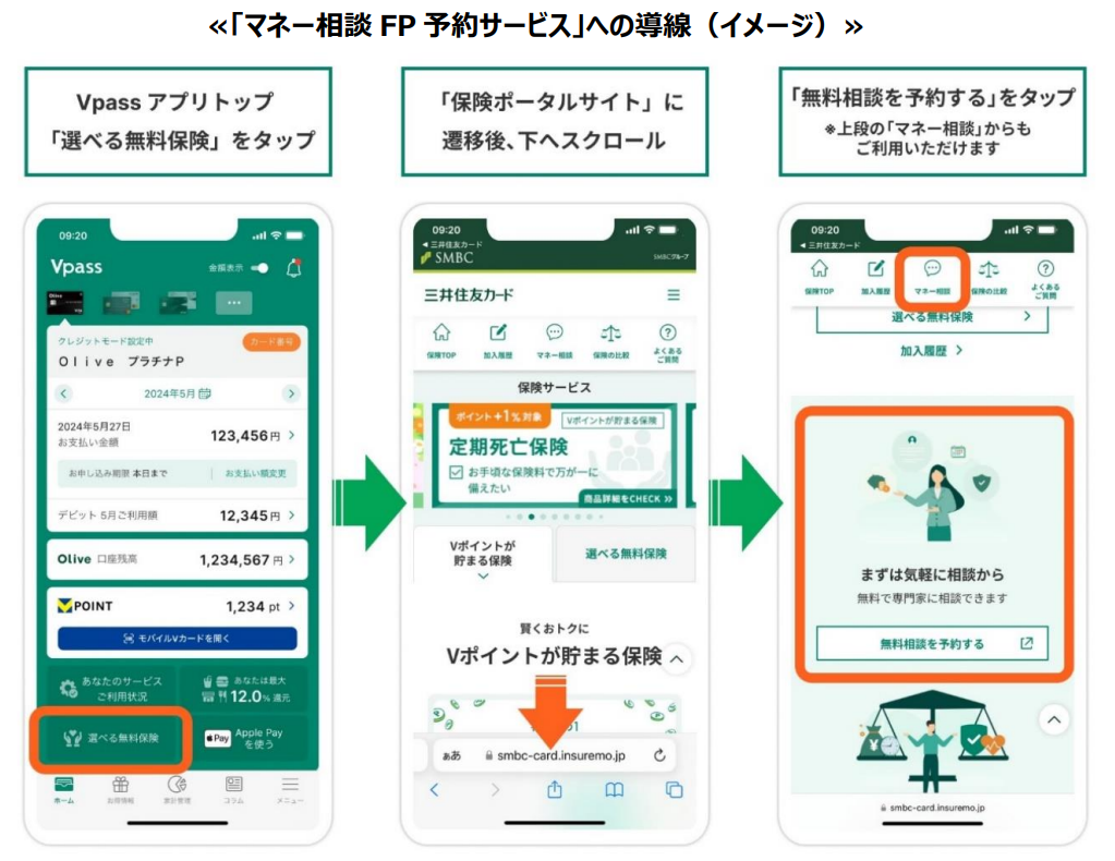 三井住友カード株式会社(本社:東京都江東区、代表取締役社長:大西幸彦、以下 三井住友カード)は、オンライン上でファイナンシャルプランナー(FP)の指名・相談予約ができる「マネー相談 FP予約サービス」を2024年6月3日より開始したことをお知らせします。本取り組みは、2023年8月30日に締結をしたSMBCグループとライフネット生命グループによる資本業務提携の具体的な取り組みのひとつとして、ライフネットみらい株式会社(URL:https://www.lifenet-mirai.co.jp/ 本社:東京都千代田区、代表取締役社長CEO:金杉 貴仁、以下 ライフネットみらい)が開発とサービス支援を行なっています。