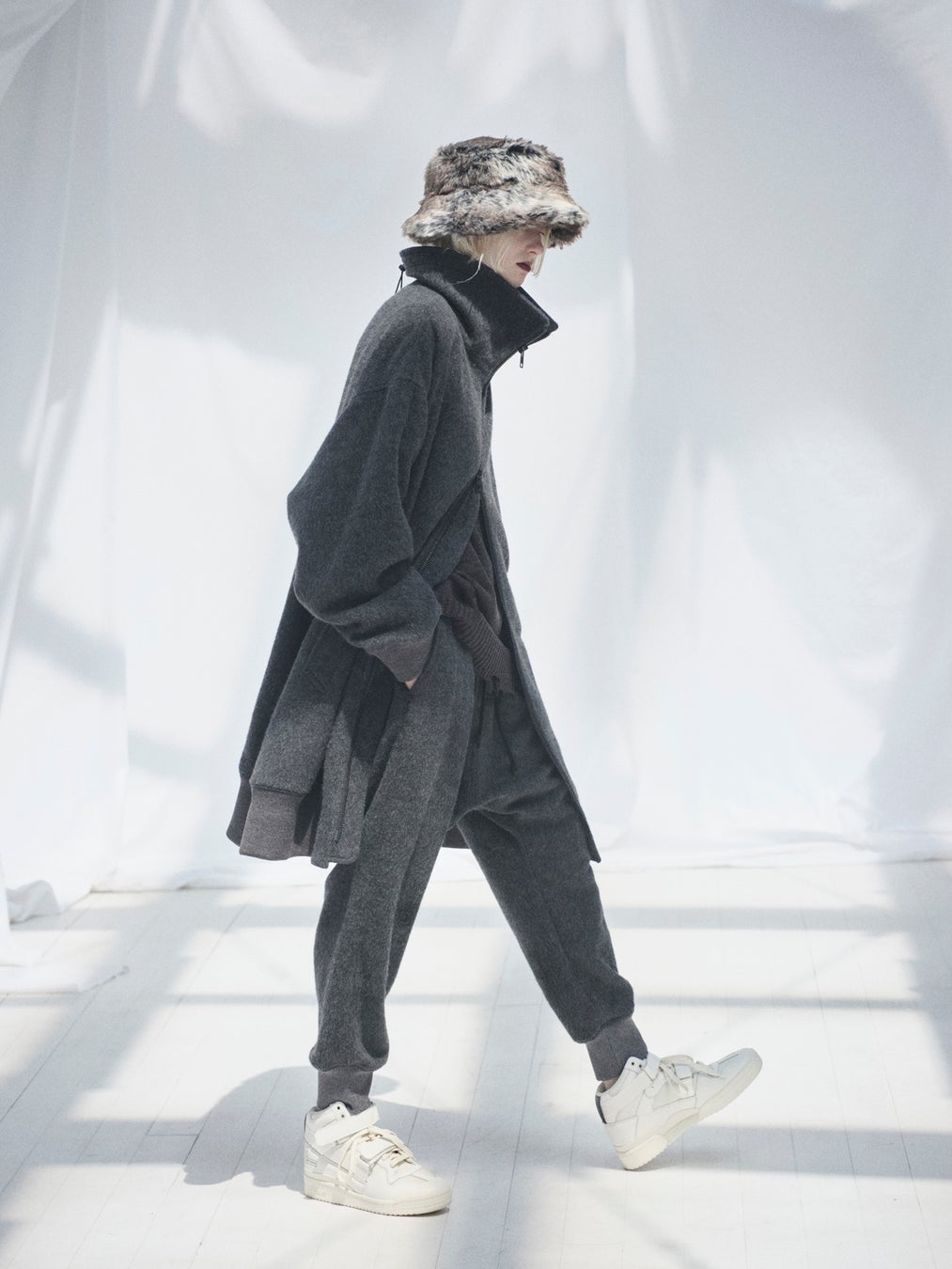 ウール素材のビックカラーコートと同素材のリブパンツ、インナーのニットもグレートーンでコーディネート、ファーハットをアクセントにする事で、スポーティーでありながらも柔らかでエレガンスに纏まったスタイル。