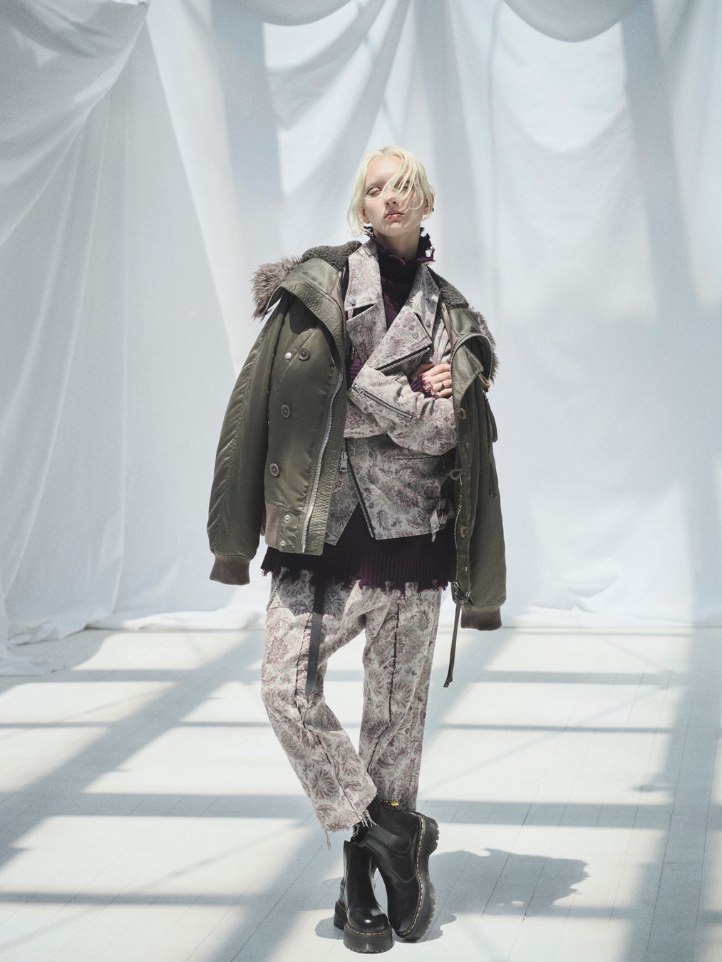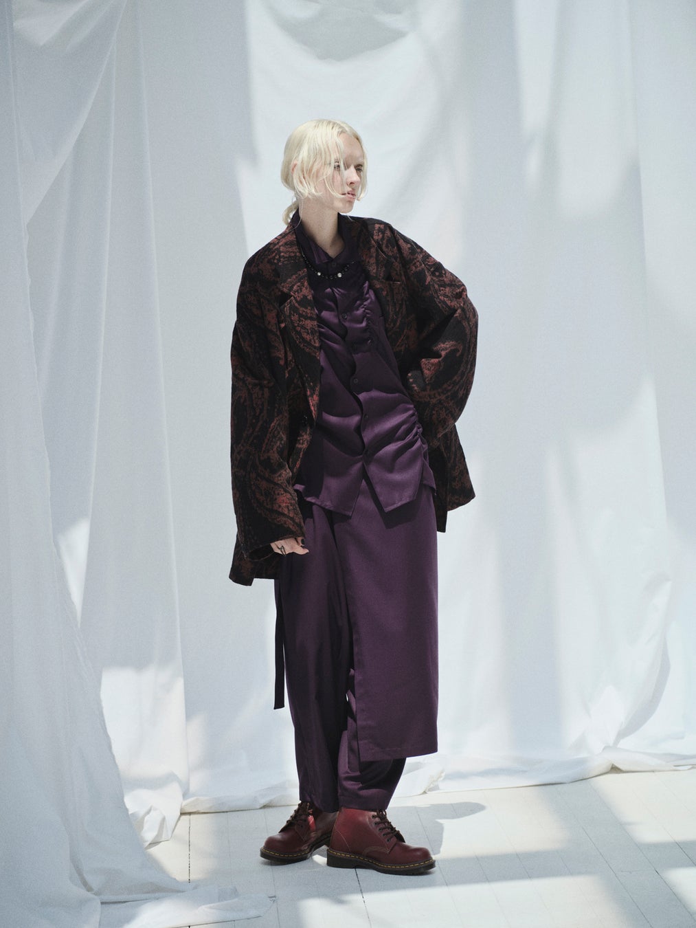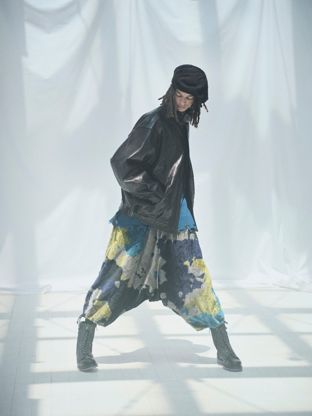 ライダース型のジャカードセットアップにN-2Bジャケットをゆったりと羽織ったスタイル。また、オレンジペイズリー柄のジャカードジャケットのインナーには紫のシャーリングが施されたシャツと、ラップパンツのセットアップ。レザージャケットにターコイズのグランジニット、パンツは黄色・青・水色・グレーが混じり合うベルベットルックや、赤のグラデーションベルベットのセットアップにブラックのシャギーニットのコーディネートは、23-24秋冬コレクションのアイコニックとなるシリーズ。