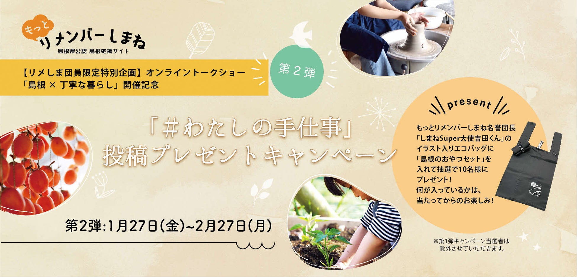 島根応援サイト「もっとリメンバーしまね」の特別企画として、2023年3月18日(土)に開催する、オンライントークショー「島根✕丁寧な暮らし」の参加者を募集します。