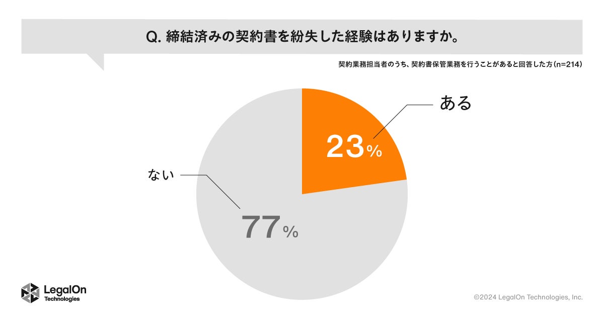 約4人に1人(23%)が締結済みの契約書を「紛失してしまった経験がある」と回答。また「締結済みの契約書の内容に違反した経験」は11%の方が経験があると回答しました。