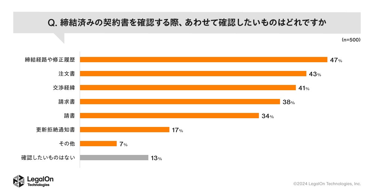 8割以上の契約業務担当者が、新しい取引の開始を検討するときや契約書レビューの際に、「過去の契約書を参考にしたい」と回答しました。一方で、半数以上(52%)が「参考にしたい契約書を見つけられなかった経験がある」と回答しました。また締結済み契約書を確認するタイミングで、「締結経緯や修正履歴」(47%)や「注文書」(43%)、「交渉経緯」(41%)など関連書類も併せて確認したいというニーズが明らかになりました。