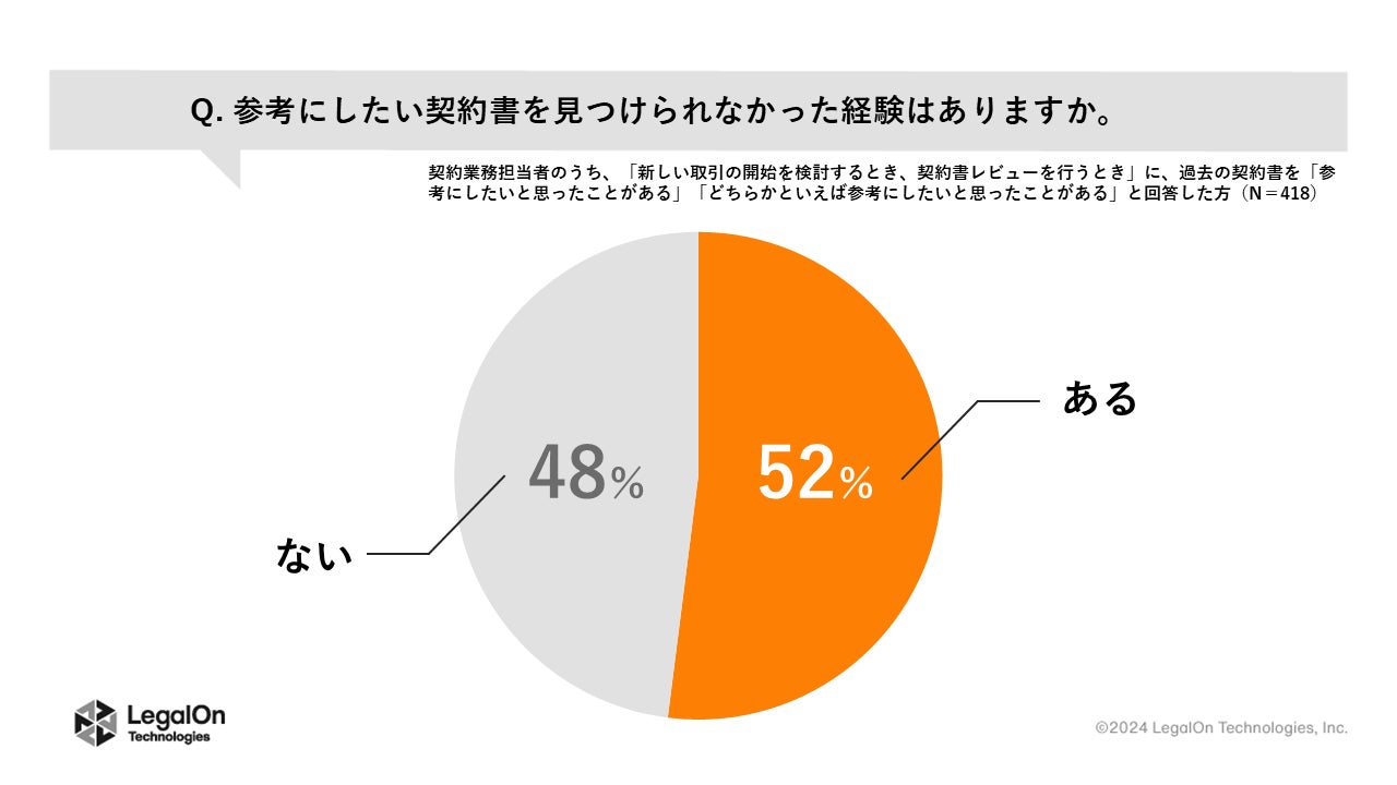 新しい取引の開始を検討するときや契約書レビューの際に、「過去の契約書を参考にしたい」と思う担当者は8割以上。一方で、半数以上(52%)が「参考にしたい契約書を見つけられなかった経験がある」と回答。