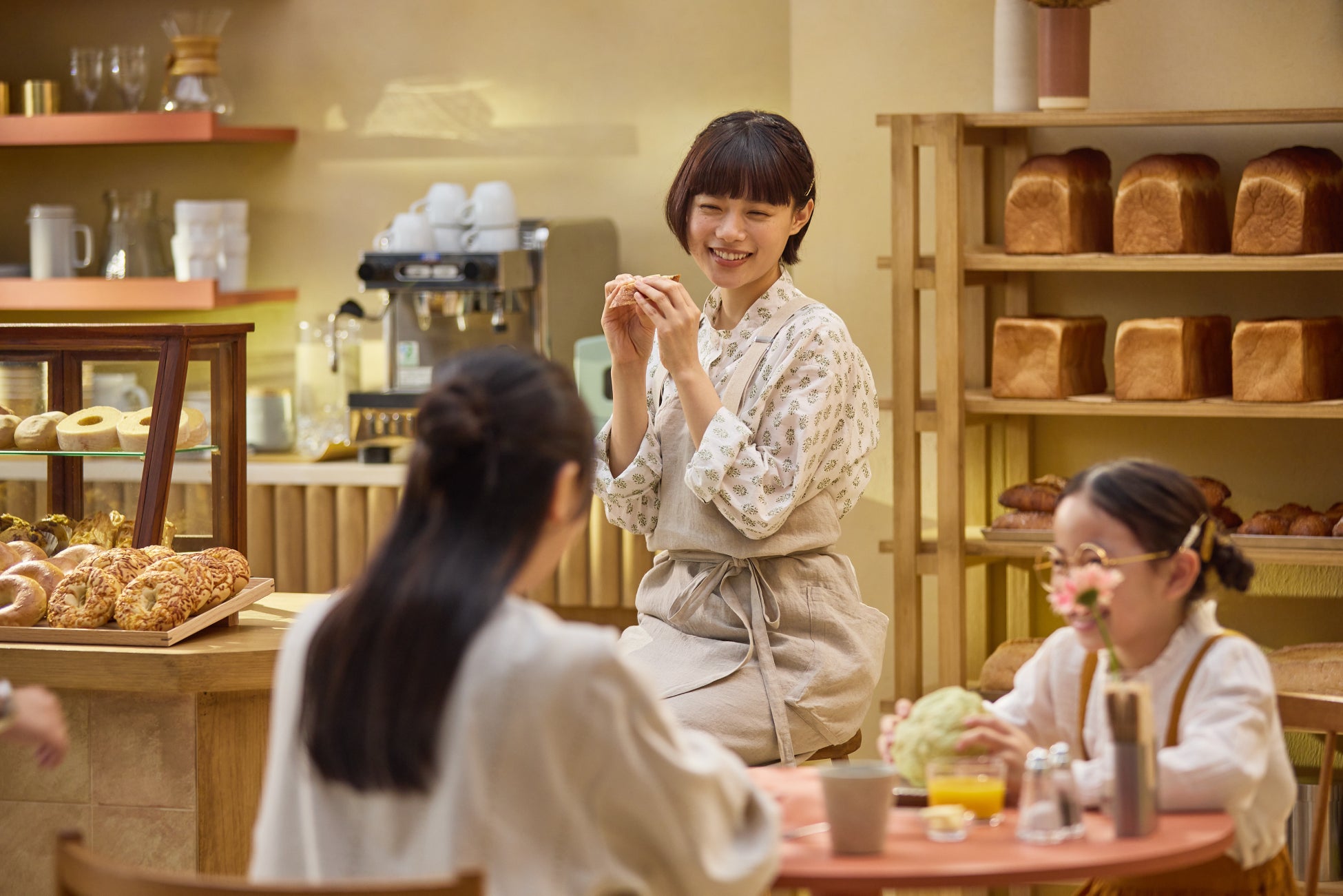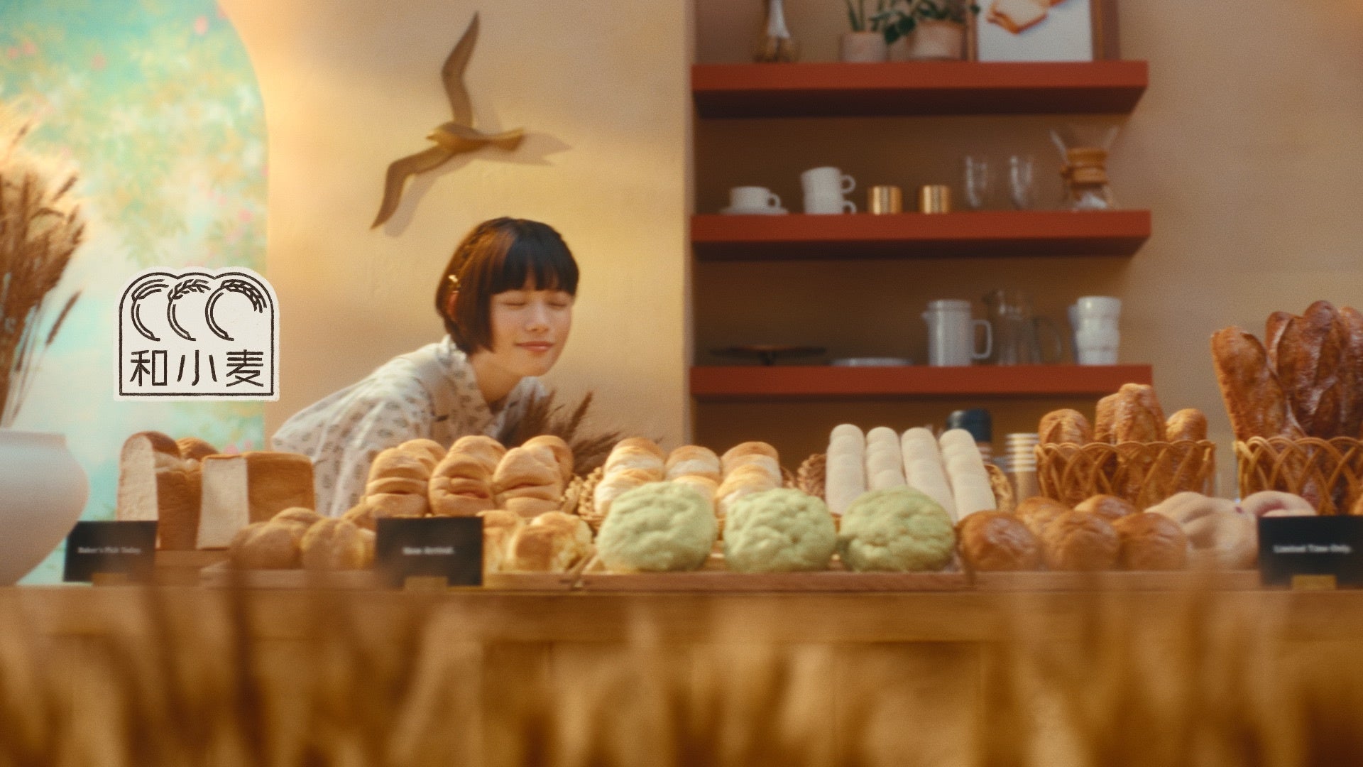 "和小麦カフェ"はまるで小麦に包まれているような雰囲気のお店。店内いっぱいに焼きたてパンが並べられ、おいしい香りで満ちている中、店長の杉咲花さんが働いています。明るく軽やかな音楽に乗せて登場する印象的な『和小麦』のロゴマークとキーフレーズで、杉咲店長も夢中になってしまう『和小麦』の魅力を伝えます。