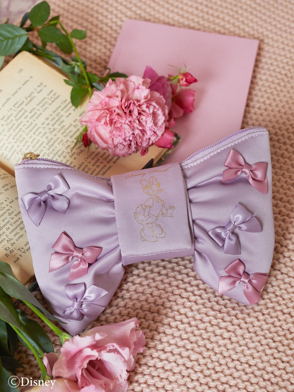 なかでも一押しは、リボン型のポーチです。デイジーダックが付けている大きなリボンをそのままポーチにしたようなアイテムで、ボディにはピンクとラベンダーの小さなリボンを複数配し、とびきりガーリーな雰囲気に仕上げました。キャラクターをイメージしたラベンダーカラーを採用し、可愛らしさの中に上品さもプラスしています。見た目の可愛らしさはもちろん、収納力も高く、お出かけの際のバッグインバッグとしてお使いいただくのもおすすめです。