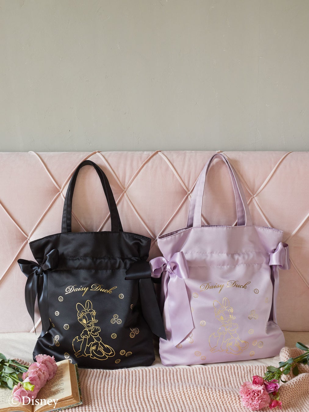 その他、デイジーの花に囲まれたキャラクターを箔でプリントしたダブルリボントートバッグや淡いくすみカラーで刺繍したサイドポケットトートバッグ、ポーチがラインナップいたします。アイテムごとに少しずつ異なるアートワークにもこだわりました。いずれも、ラベンダーカラーに加え、落ち着いたブラックの2色展開です。