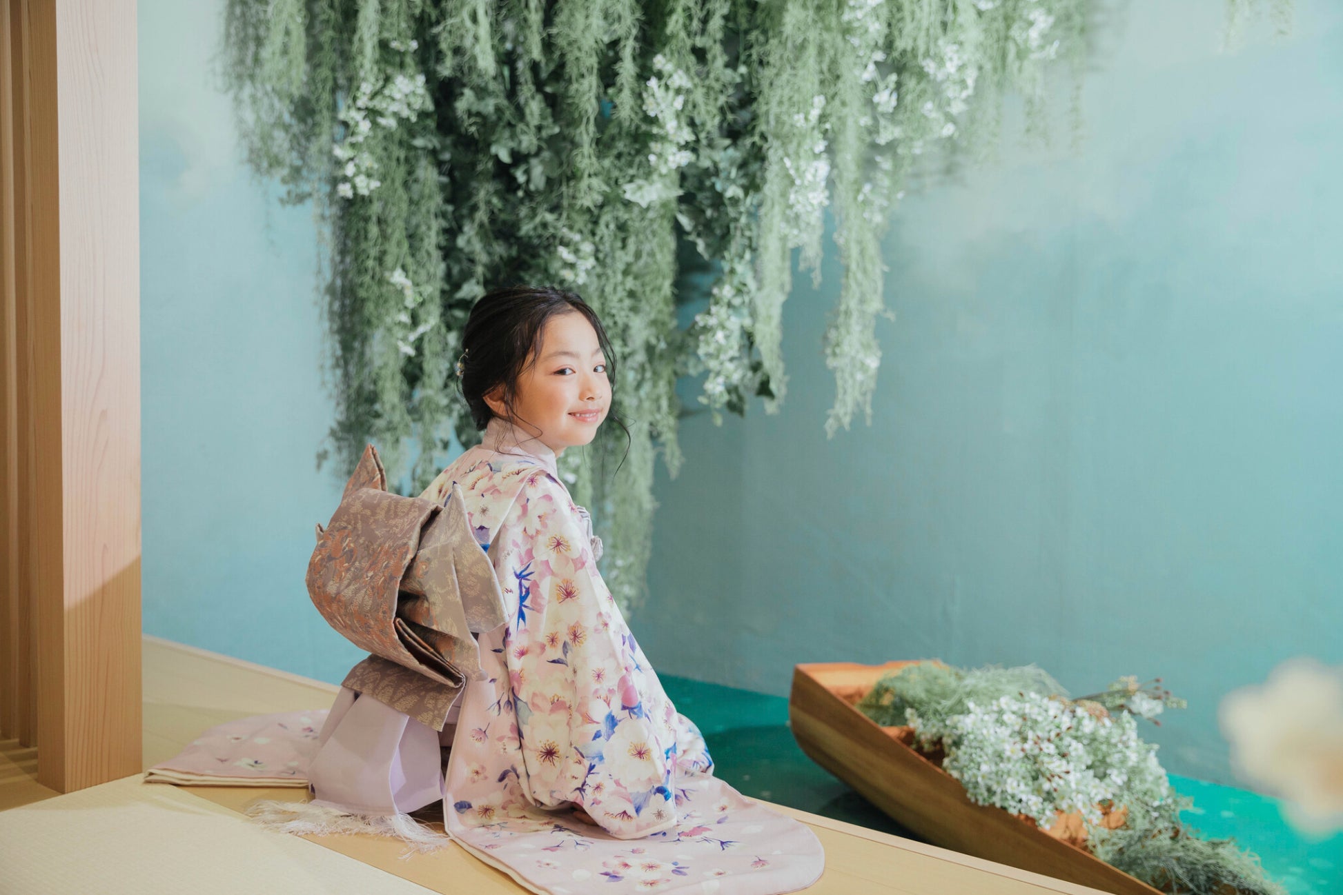 寝ころがり撮影をするベビーからお草履を履いてフォーマルに撮影する七五三までどんな身長でも撮影可能なように工夫されています。