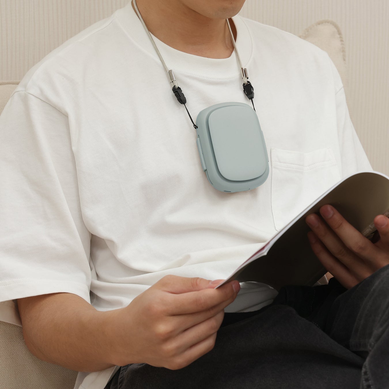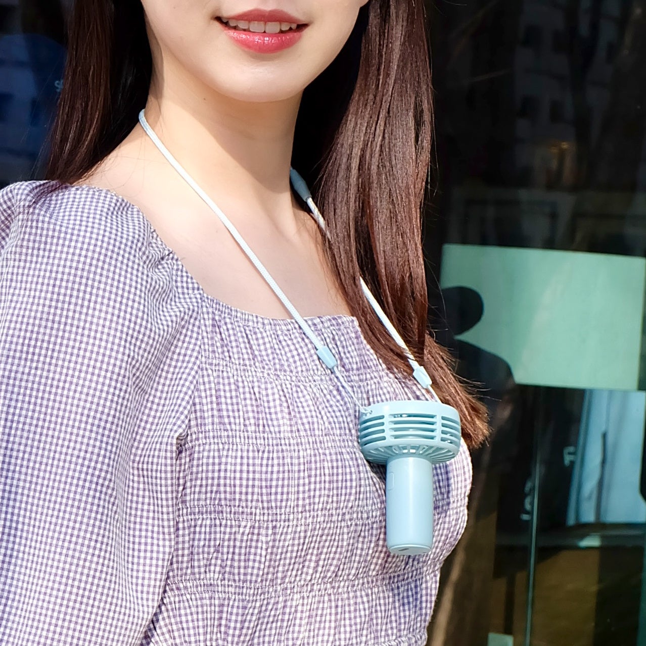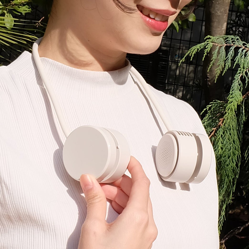 特徴 :コードリールはカラビナ付きで、カバンやズボンのベルトループに取り付けて使えます。手のひらサイズのファンはコンパクトで目立たず、ネックストラップ付きでハンズフリーにも対応。リズム風モードで快適な風を提供し、持ち運び時の誤作動防止機能も備えています。