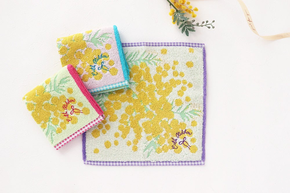 本アイテム限定のミモザ柄下げ札を使用し、タオルのカラーに合わせた3配色展開で、細部までこだわりました。