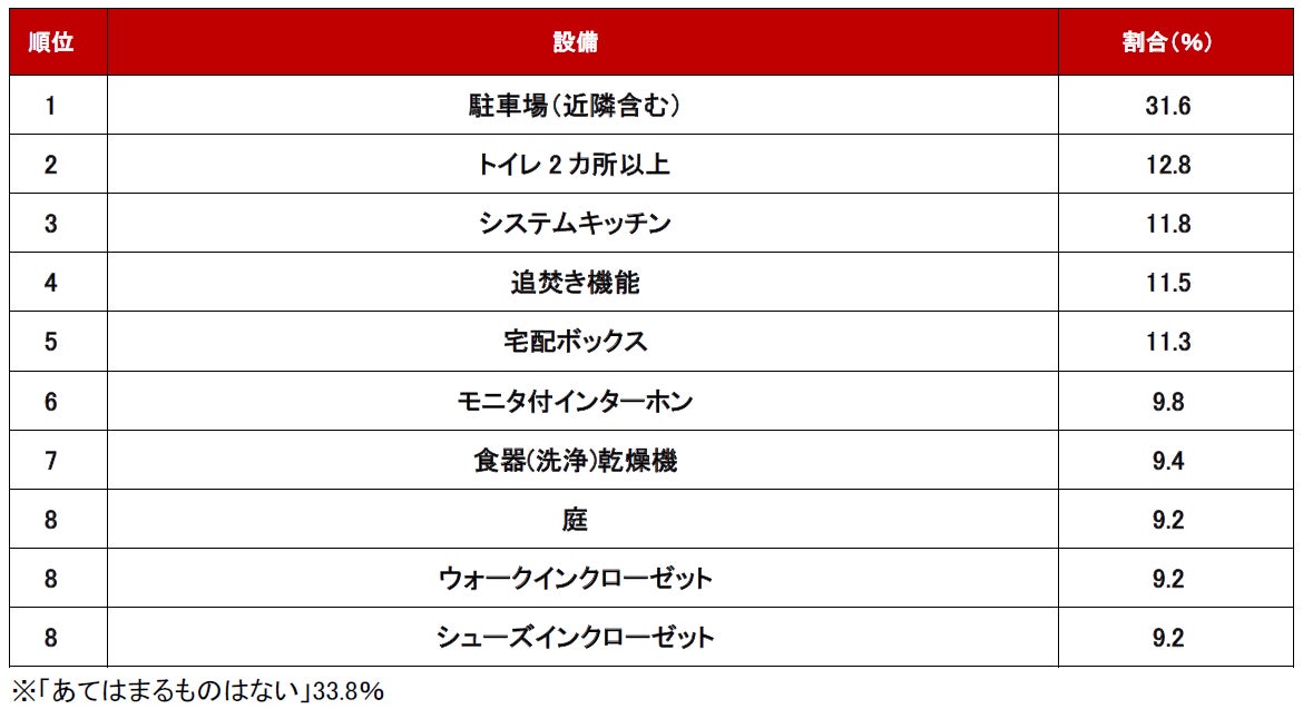 一戸建て編の1位もマンション編と同様に、「駐車場(近隣含む)」でした。不動産会社からは「車を2台以上持っているお客さまが増えた」や「来客用の駐車スペースが欲しいと言うお客さまが増えた」という声が上がり、特に車での移動が主な移動手段となる地域では駐車スペースを複数確保する必要がありそうです。
