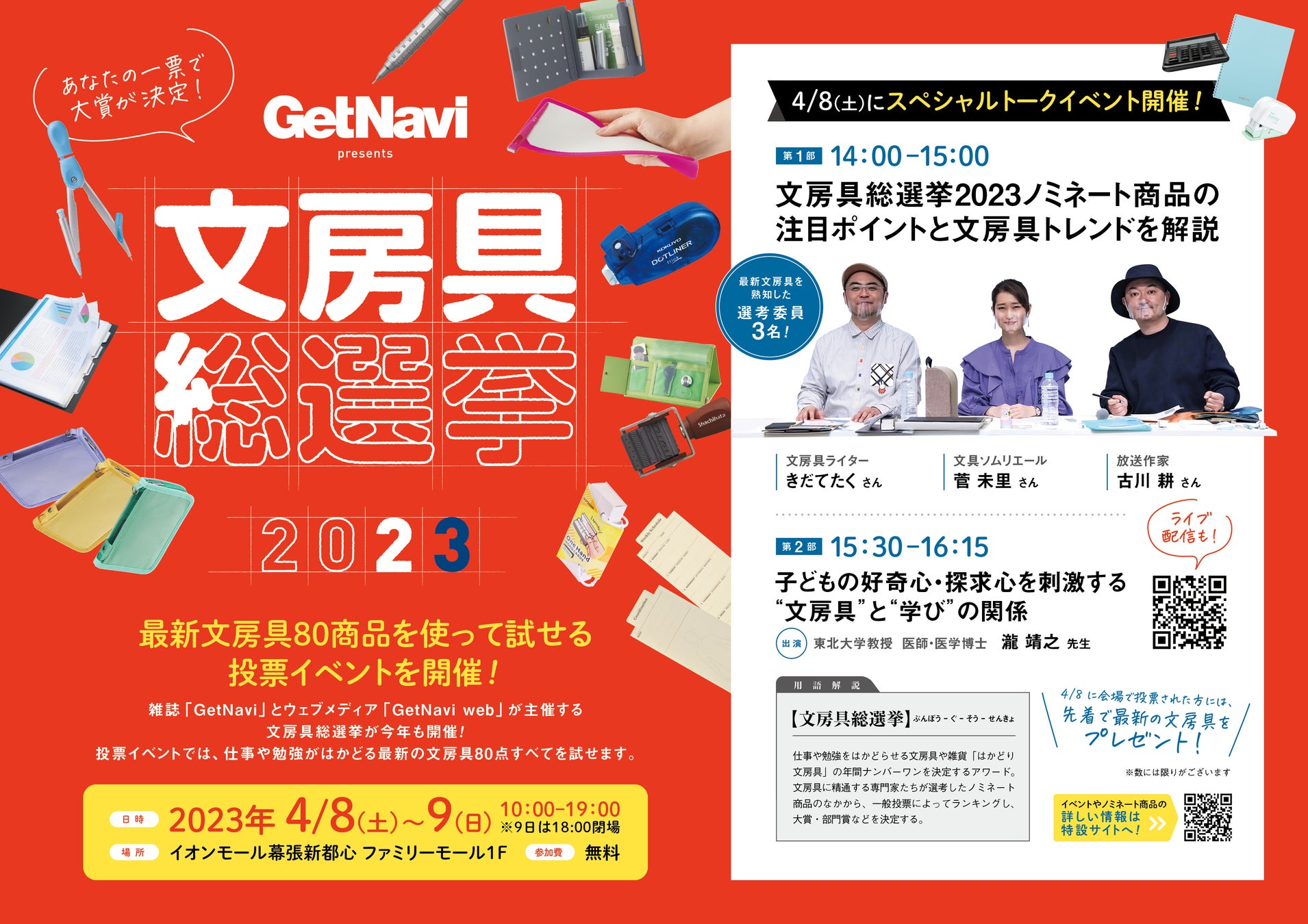 株式会社 ワン・パブリッシング(東京・台東区/代表取締役社長:廣瀬有二)は、モノトレンド情報誌「GetNavi」とウェブメディア「GetNavi web」において、2022年度に発売された新作文房具のナンバーワンを決めるアワード「文房具総選挙2023」を開催しています。3月下旬より投票を受け付け中ですが、4月8日(土)・9日(日)の2日間、イオンモール幕張新都心(千葉県)で、本アワードにノミネートしている文房具80点を実際に使って試した上で投票できる、投票イベントを実施します。