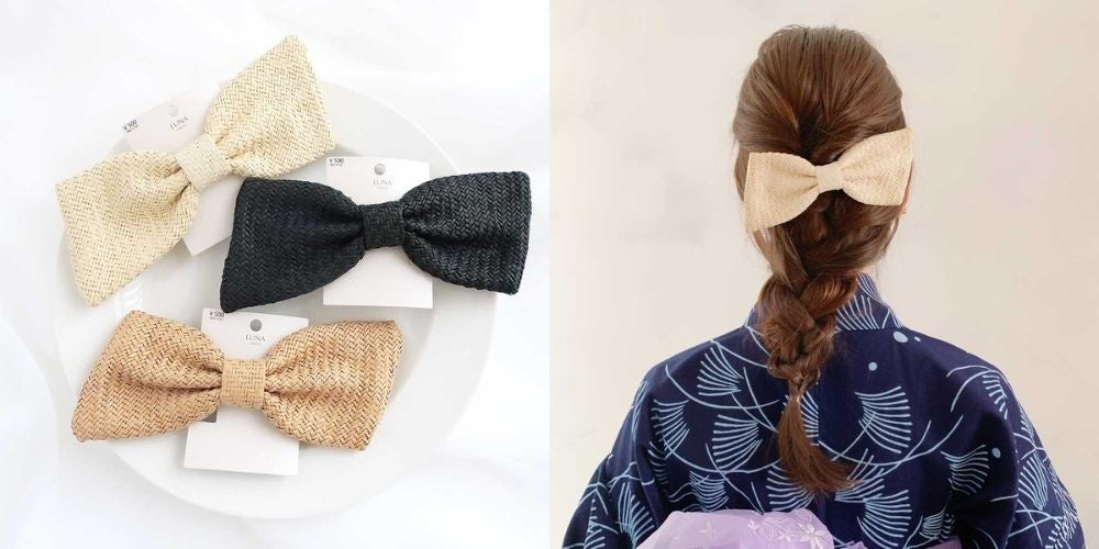 夏らしい素材とボリュームのあるリボンが可愛いバレッタは、その存在感のあるデザインとは裏腹に、ナチュラルでベーシックな色合いが浴衣の装いを引き立ててくれます。